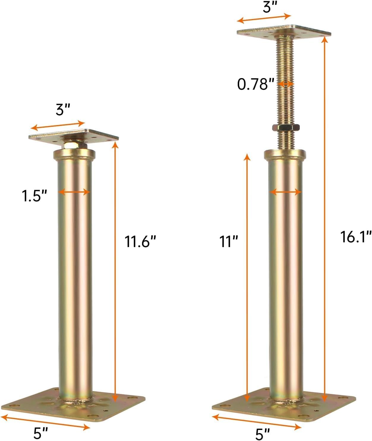 Package included: 6 X Adjustable Basement Support Screw Jack Specification: 100% brand new Material: Steel Color: Golden Coat: Galvanized Dimension Lifting height:11.6''-16.1'' Max Height Capacity: 8800 lbs (4 ton) Base plate dimension: 5" x 5" x 0.19" Top plate dimension: 3" x 3" x 0.19"