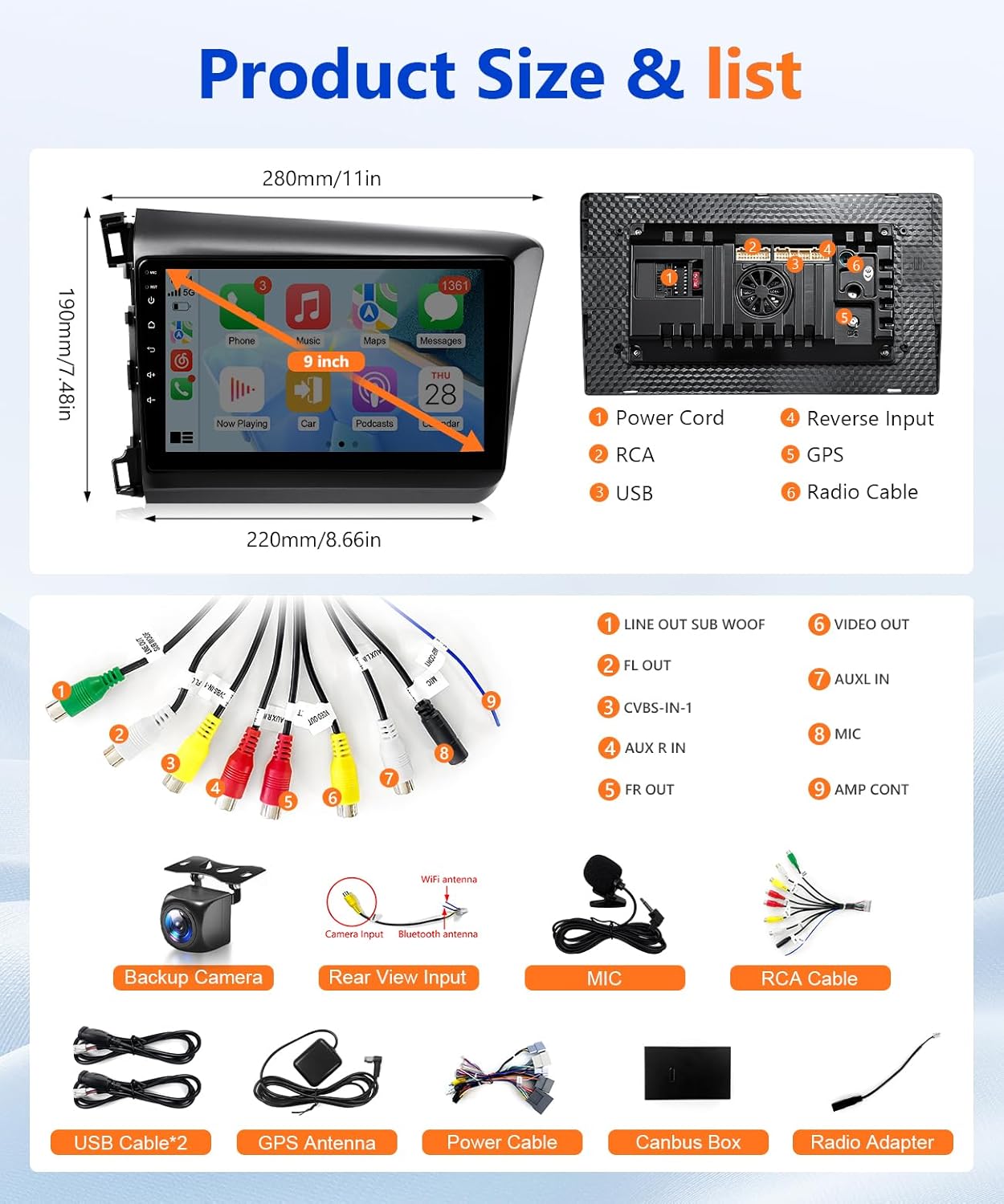| BuiltIn Media | 9inch IPS Touchscreen Android 13 Radio Headunit, 2012 to 2015 Honda Civic Car Radio Frame, CANBUS, Plug and Play Power Harness, Back-up Camera, Reversing Camera Input Cable, English User's Manual, Installation Diagram, GPS Antenna, Full RCA Cable, 2 USB Cable, External MIC |
