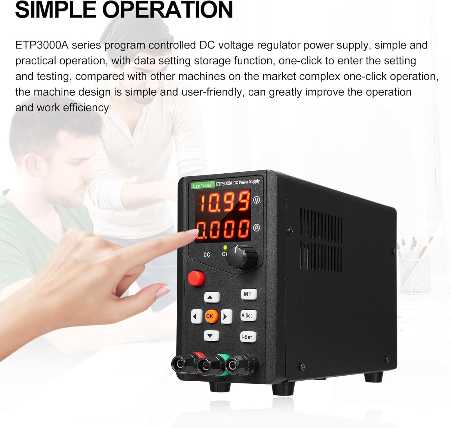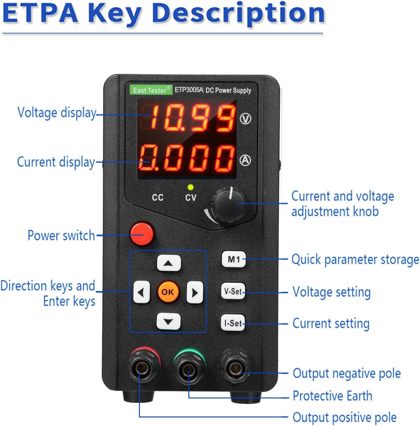 with four digits LED digital display. It can simulta usly display vol e, t; Const vol e (CV), const t(CC)mode automatic switching, vol e and t can be continuously adjusted; Using switching power control technology and components, high efficiency, lightweight, energy saving and . Caution: US Plug Input Vol e: 100-120V EU/UK Plug Input Vol e: 200-240V Specifications: Plug: EU / US / UK (Optional) Model: ETP3005A Material: Plastic + Galvanized Sheet Output Vol e: 0~15V, 0~15V, 0~30V, 0~30V, 0~30V, 0~60V, 0~60V Output t: 0~3A, 0~6A, 0~3A, 0~5A, 0~10A, 0~3A, 0~5A Output Power: 45W, 90W, 90W, 150W, 300W, 180W, 300W Steady State: Vol e stability: ≤0.1%±3mV Load stability: ≤0.1%±3mA Steady State: t stability: ≤0.1%±3mV Load stability: ≤0.1%±3mA Display Accuracy: Vol e: 0.5%±3 bits t: 0.5%±3 bits ple and Noise: VPP ≤1% Display Resolution: Vol e: up to 10mV t: up to 1mA Power: up to 10mW Display Method: 4-bit red LED Nixie tube, 0.40 inch Power Input: AC ±10%/50Hz or AC ±10%/60Hz (Users need to explain when purchasing) Operating Environment: Indoor use, altitude: ≤2000m, temperature: 5~40℃, hu ity: 10~85%RH Storage Environment: Temperature: -20~80℃, hu ity: ≤80%RH Item Size: 190 * 70 * 130mm / 7.48 * 2.75 * 5.11in Item Weight: 995g / 2.19lb Package Weight: 1329g / 2.93lb Package Size: 26 * 13.5 * 18cm / 10.23 * 5.31 * 7.08in Package List: 1 * DC Regulated Power ply 1 * Power Cable 1 * Alligator Clip Cable 1 * User Manual (En sh)