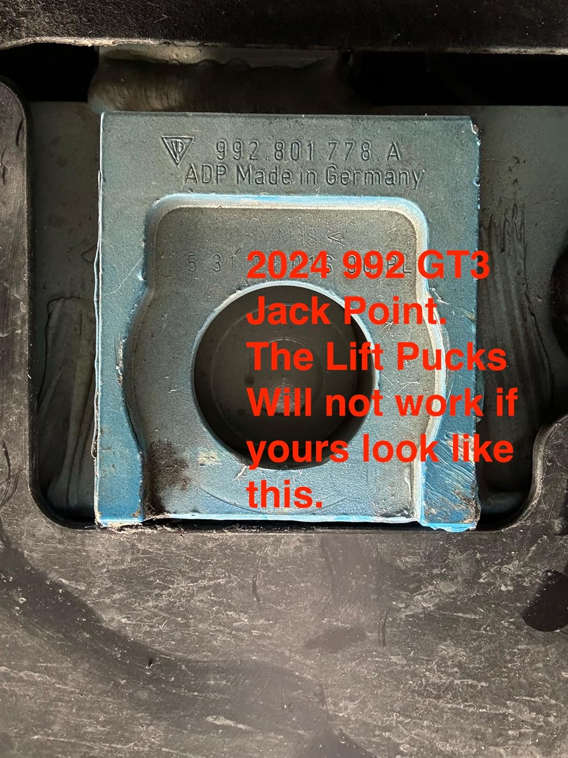 Set of Four (4) Lift Pucks designed specifically for the 2020-2024 992.1 911 Carrera, Carrera T and Carrera S vehicles only. Your four jack points should have a 1 inch diameter hole to accept these, please verify prior to ordering. Please also study photos provided. Some 2024 Carrera T models have the GT3/RS style of Jack Points (last two photos) and these will not fit those cars. Made of hard slip-resistant rubber (91 durometer) and aircraft quality aluminum tops. Rubber portion has been counter-bored and aluminum top is secured with a ¼-20 hex bolt. Rubber portion has knurling on the edge for better grip. These are an interference fit, at each jack point there’s a 1-inch hole where these get hand-pressed into and proceed with your jack. To remove, just wiggle them out and remove after work procedure is complete. If you are using a jack stands with these, please use the type with a flat landing surface versus the u-shaped axle stands.