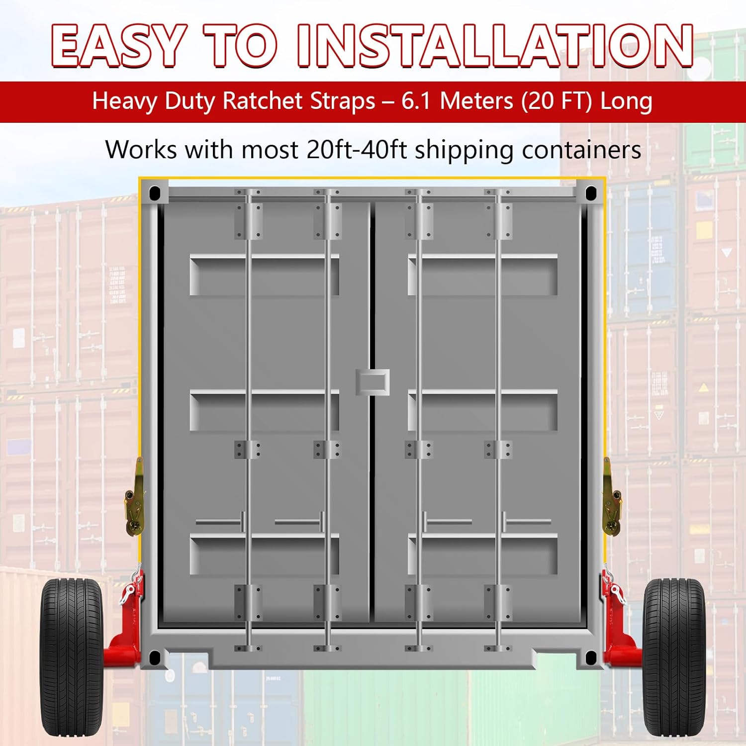 | Included Components | 2pcs x Shipping Container Wheels; 2pcs x Shackles;2pcs xRatchet Strap Tie-Downs |
