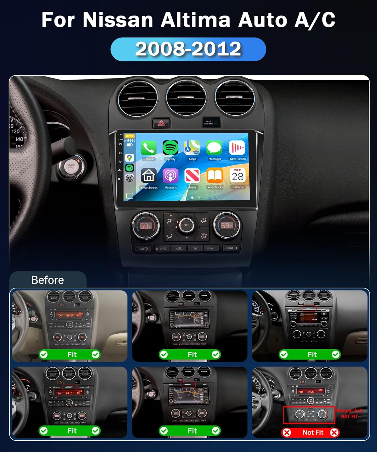 | Additional Features | Bluetooth, Car Radio for Nissan Altima 2008 2009 2010 2011 2012(Auto A/C), IPS Touchscreen, Wireless Carplay & Android Auto |