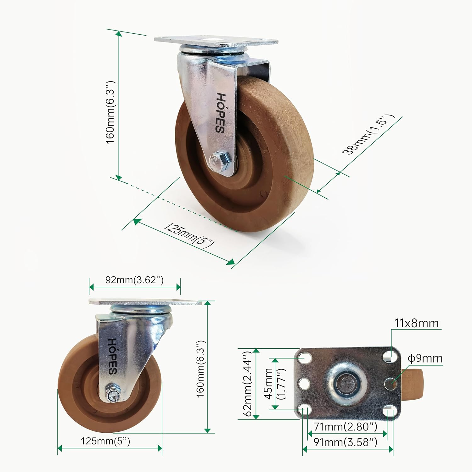 Transform your equipment mobility with these robust 5-inch heavy-duty casters, perfect for commercial kitchens and bakeries. This set includes 2 brake and 2 swivel casters, crafted from heat-resistant glass-filled nylon that can handle up to 2800 pounds of total weight capacity. The brown wheels feature a durable construction that withstands high temperatures, making them ideal for demanding industrial environments. Each caster comes with a sturdy mounting plate and smooth-rolling design that reduces noise and protects your floors. The braking mechanism on two of the casters provides excellent stability when needed, while the swivel function ensures maximum maneuverability. These casters are engineered for continuous use in commercial settings, offering reliable performance and smooth operation. Their compact yet powerful design makes them perfect for equipment, carts, and other mobile units in professional food service environments. Innovative Material Creation:These high - temperature - resistant nylon casters are made of 33% glass fiber reinforced, heat - stabilized nylon 6/6 via injection molding. The material offers scratch - free movement, low water absorption for longer lifespan, and strong chemical resistance to most solvents, oils, acids, and chemicals. Outstanding High - Temperature Capability:These casters can operate steadily across a wide temperature range, from - 40°F to + 475°F, and intermittently at 536°F. Their excellent heat resistance makes them ideal for high - demand industrial scenarios like autoclaves, product surface treatment, food processing, and other extreme environments, ensuring equipment runs smoothly. Mighty Heavy - Duty Capacity:The 5 - inch glass nylon casters are really tough on wear and tear. They can easily deal with high - intensity friction and damage. They're also great at handling impacts, taking strong hits without breaking. A set of 4 of these industrial casters can hold up to 2800 lbs, way more than regular high - temperature - resistant phenolic casters. And after a long time of use, it's proven that glass nylon casters don't crack or get brittle over time like phenolic casters do, offering much more stable performance. Smart Size Design:The top plate of the caster is designed really well. It's 3 - 5/8 inches long and 2 - 3/8 inches wide, with holes spaced 2 - 3/4 inches by 1 - 3/4 inches. This sizing makes it fit all kinds of equipment perfectly. The glass nylon wheel is 4 inches by 1 - 1/2 inches, and the whole caster is 5 - 1/16 inches tall. This gives it enough support and also keeps it flexible, so the equipment can move around smoothly and easily. Thoughtful Customer Service:We always put our customers first. We've got a professional and friendly customer service team for these casters. If you have any problems while using them, just reach out to us. We'll get back to you right away and come up with full - scale solutions, making sure every customer has a great experience.