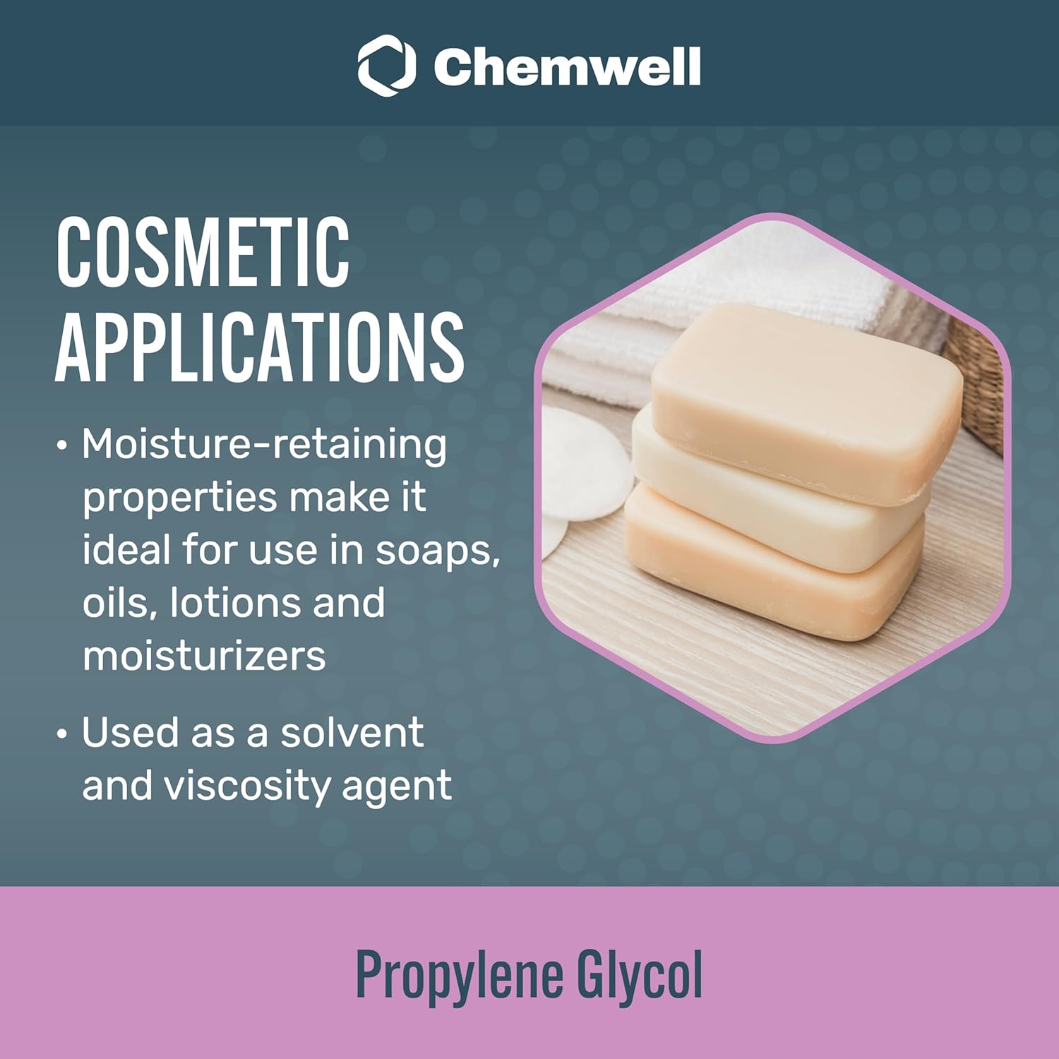 Chemwell Propylene Glycol is a 99.9% pure, food-grade compound known for its exceptional versatility and performance. Whether you're formulating skincare products, preserving moisture in food, or using it as a carrier fluid in lab and industrial settings, this high-purity glycol delivers consistent results across a wide range of applications.Clear, odorless, and water-soluble, it functions as a humectant, solvent, and stabilizer in everything from cosmetics to foods to fog machines and antifreeze systems. The 32 fl oz bottle is sealed and easy to handle, making it a reliable staple for home and professional use alike.