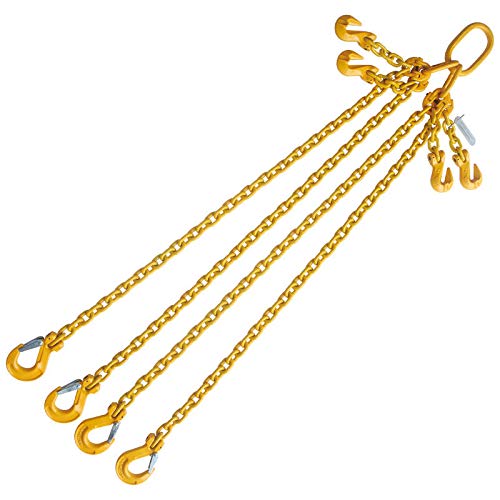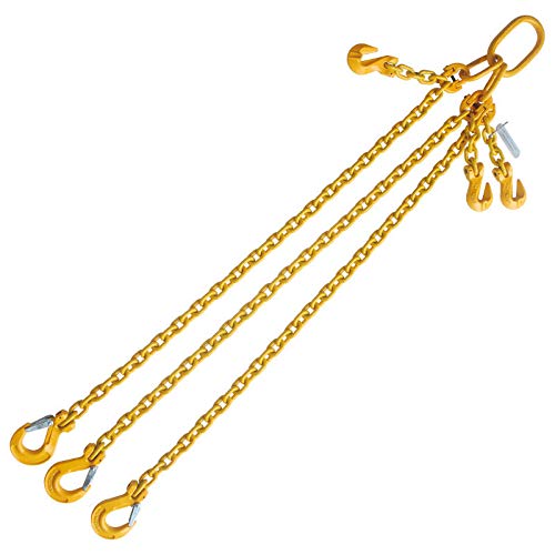 5/16" x 10' Grade 80 Adjustable Lifting Chain Sling with Sling Hook Double Leg Chain Lifting Slings offer a rugged durable lifting option when other methods just won't get the job done. Made with alloy grade steel chain with hook or link, these chain slings can be used when you need to lift with confidence. For those occasions where you're concerned about marking or crushing the load, we offer a wide range of web lifting slings and round slings to meet all of your lifting needs. Adjustable feature allows length to be adjusted for easy job handling. Rated Capacity : 60° Sling Angle : 7,800 lbs 45° Sling Angle : 6,300 lbs 30° Sling Angle: 4,500 lbs Features : Chain : 5/16" Grade 80 Alloy Finish : Painted Yellow over Zinc Plated for Durability 5 Link Chain with Clevis Grab Hook to Adjust Leg Length Reach : 10 FT. The distance between the upper and lower bearing (load) points of a single leg Each Sling with Aluminum Tag Showing Capacity USA Assembled! Inspect prior to usage Never exceed rated capacity Avoid shock loads