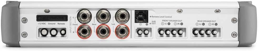 5-Channel Class D Marine System Amplifier, 100 W x 4 + 500 W x 1 Thanks to its ability to act as a "one-box solution", the MHD900/5 is ideal for installations where space is at a premium and sound quality is the paramount goal. While extremely compact, this amazing amplifier will comfortably drive a complete high-performance marine audio system: that is, four satellite speaker systems and a subwoofer system... with a very serious 900 watts of power! Using our Single Cycle Control switching design and R.I.P.S technology, the MHD900/5 delivers 100 W x 4 to its four main channels, plus a very meaty 500W to its subwoofer channel. Thanks to R.I.P.S., high power can be delivered over a wide range of load impedances, while the tight power supply regulation keeps distortion down, maximizing sound quality. This marine amplifier features white and gray powder-coat finishes, a gasketed cover for the controls and stainless steel hardware for durability in the marine environment. Main Channels @ 4 Ω 100 W RMS x 4 Main Channels @ 3 Ω 75 W RMS x 4 Main Channels @ 2 Ω 75 W RMS x 4 Main Channels @ 1.5 Ω 75 W RMS x 4 Main Channels - Bridged @ 8 Ω 200 W RMS x 2 Main Channels - Bridged @ 4 Ω 150 W RMS x 2 Subwoofer Channel @ 4 Ω 500 W RMS x 1 Subwoofer Channel @ 3 Ω 500 W RMS x 1 Subwoofer Channel @ 2 Ω 500 W RMS x 1 Subwoofer Channel @ 1.5 Ω 500 W RMS x 1 Main Channels @ 4 Ω 100 W RMS x 4 Main Channels @ 3 Ω 75 W RMS x 4 Main Channels @ 2 Ω 75 W RMS x 4 Main Channels @ 1.5 Ω 75 W RMS x 4 Main Channels - Bridged @ 8 Ω 200 W RMS x 2 Main Channels - Bridged @ 4 Ω 150 W RMS x 2 Subwoofer Channel @ 4 Ω 500 W RMS x 1 Subwoofer Channel @ 3 Ω 500 W RMS x 1 Subwoofer Channel @ 2 Ω 500 W RMS x 1 Subwoofer Channel @ 1.5 Ω 500 W RMS x 1 Frequency Response (Main Channels) 12 Hz - 28 kHz (+0, -1dB) Frequency Response (Subwoofer Channel) 12 Hz - 10 kHz (+0, -1dB) S/N Ratio, referred to highest rated power (Main Channels) >108.5 dB below rated power (A-weighted, 20 Hz - 20 kHz noise bandwidth) S/N Ratio, referred to 1 W (Main Channels) >88.2 dB (A-weighted, 20 Hz - 20 kHz noise bandwidth) Damping Factor @ 4 Ω >400 / 50 Hz Damping Factor @ 2 Ω >200 / 50 Hz THD+N @ Rated Power (Main Channels) <0.03% @ 4 Ω THD+N @ Rated Power (Subwoofer Channel) <0.05% @ 4 Ω Input Voltage Range @ RCA Inputs Switchable from 200 mV - 2 V RMS (Low) to 800 mV - 8 V RMS (High) Min.Copper Power / Ground Wire Gauge Accepts up to 4 AWG wire Fuse Rating 60 A (AFS, AGU or MaxiFuseâ¢) Filter Mode(s): Channels 1 & 2 (front) High-Pass only Filter Slope(s): Channels 1 & 2 (front) 12/24 dB/octave Filter Frequency Range: Channels 1 & 2 (front) 50 Hz - 500 Hz Filter Mode(s): Channels 3 & 4 (rear) High-Pass only Filter Slope(s): Channels 3 & 4 (rear) 12/24 dB/octave Filter Frequency Range: Channels 3 & 4 50 Hz - 500 Hz Filter Mode(s): Subwoofer Channel Low-Pass only Filter Slope(s): Subwoofer Channel 12/24 dB/octave Filter Frequency Range: Subwoofer Channel 50 Hz - 500 Hz Detented, Calibrated Filter Freq. Potentiometers Yes Filter Defeat Function Yes Infrasonic Filter: Subwoofer Channel 30 Hz, Defeatable Remote Level Control Optional (HD-RLC) Remote Level Modes Sub Ch. only Channel Input Mode Switch Yes (2/4/6 ch.) Pass-Through Preamp Output None Source Channel Selection for PreOuts N/A Height (H) 1.93 in / 49 mm Width (W) 10.74 in / 273 mm Depth (D) 8.29 in / 211 mm Net Weight 6.85 lb / 3.11 kg Single Cycle Control⢠Summary: High-Fidelity, full-range Class D is a reality. Detailed Information: Single Cycle Control is a unique approach to controlling a full-range Class D amplifier. By tracking the audio signal, comparing it to the real PWM waveform and then correcting it in each and every cycle (over 400,000 times per second), a multitude of distortion-causing mechanisms can be tightly controlled to enable pristine amplification. In more technical terms, our approach is a non-linear control method that monitors the switched variable on a cycle-by-cycle basis so that, in each cycle, the average value of the output (power to the speaker) accurately tracks the input signal. This ensures that power supply disturbances, non-ideal switching edge behavior, component non-linearities and other distortion-causing problems are completely cancelled and taken out of the equation. In addition to the sonic benefits of Single Cycle Control Class D, the technology also results in outstanding efficiency (80% at 1/2 rated power for the whole amplifier, including its power supply), which translates to 60% less current draw than a typical Class A/B car amplifier of equal power. This tremendous efficiency advantage also leads to less generated heat which allows the chassis size to be reduced to about 1/4 the size of a similarly powerful Class A/B design. So, while there may be less expensive ways to make a full-range switching amplifier, no other Class D control system works faster or more accurately than Single Cycle Controlâ¢, which is why no other mobile audio amplifier in the world performs like a JL Audio HD. R.I.P.S. â Regulated, Intelligent Power Supply Summary: The remarkable R.I.P.S. System ensures consistent power delivery over a wide range of battery voltages and load impedances. Detailed Information: R.I.P.S. stands for "Regulated, Intelligent Power Supply" and is a central feature of JL Audio's 'Slash' and HD amplifiers. "Regulated" means that the power supply adjusts its operation so as to maintain the amplifier's rated power output and low distortion operation over a wide range of vehicle voltages (11V-14.5 V). This contrasts with conventional, "unregulated" power supplies, which allow rail voltages to sag in direct proportion to drops in the supply voltage. This can result in significant power losses when battery voltage decreases, even if those voltage dips are short in duration. This manifests itself audibly as increased distortion. With a JL Audio R.I.P.S.-equipped amplifier, the rail voltage and clean power output remain completely