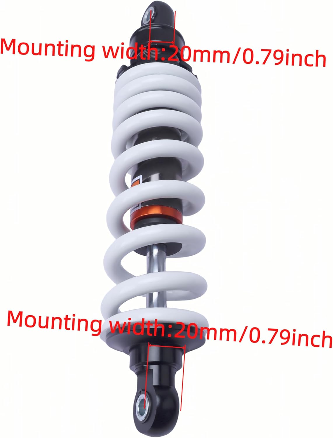 325mm 12.8 inch 800lbs Rear Shock Absorber Suspension Rear Shock Absorber with Damping Eye to Eye Length:325mm /12.8 inch Total Length:360mm/14.17 inch Spring Thickness:12mm/0.47inch Mounting Hole Diameter:10mm/0.40inch Mounting Width:20mm/0.79inch Loading Capacity:800lbs Material Aluminum Alloy This shock is widely used on 110cc, 125cc, and 150cc motorcycles, dirt bikes, pit bikes, ATVs, quads, go karts, scooters, as well as small motorcycles and scooters in the 50cc–200cc range. Built from solid steel and aluminum alloy with a white painted spring and black anodized body, it offers durability, rust resistance, and long-lasting performance. Engineered to absorb bumps and reduce vibration, the suspension improves stability and comfort for off-road trails, motocross racing, daily commuting, and go kart rides. Whether as an upgrade or a replacement part, this universal suspension ensures smoother handling and dependable performance for riders of all levels. Package includes 1 × rear shock absorber. AuryngMD is one of a professional manufacturer and seller of Motorcycles, Off-Road Dirt Bike, All Terrain Vehicles, Go Karts and Garden Tractor accessories, providing a full range of reliable and diverse accessories and after-sales parts. Warning! Please carefully confirm the size and model of the product before purchasing. If you have any questions, please leave us a message and we will reply within 24 hours. All of our products support return and exchange services.