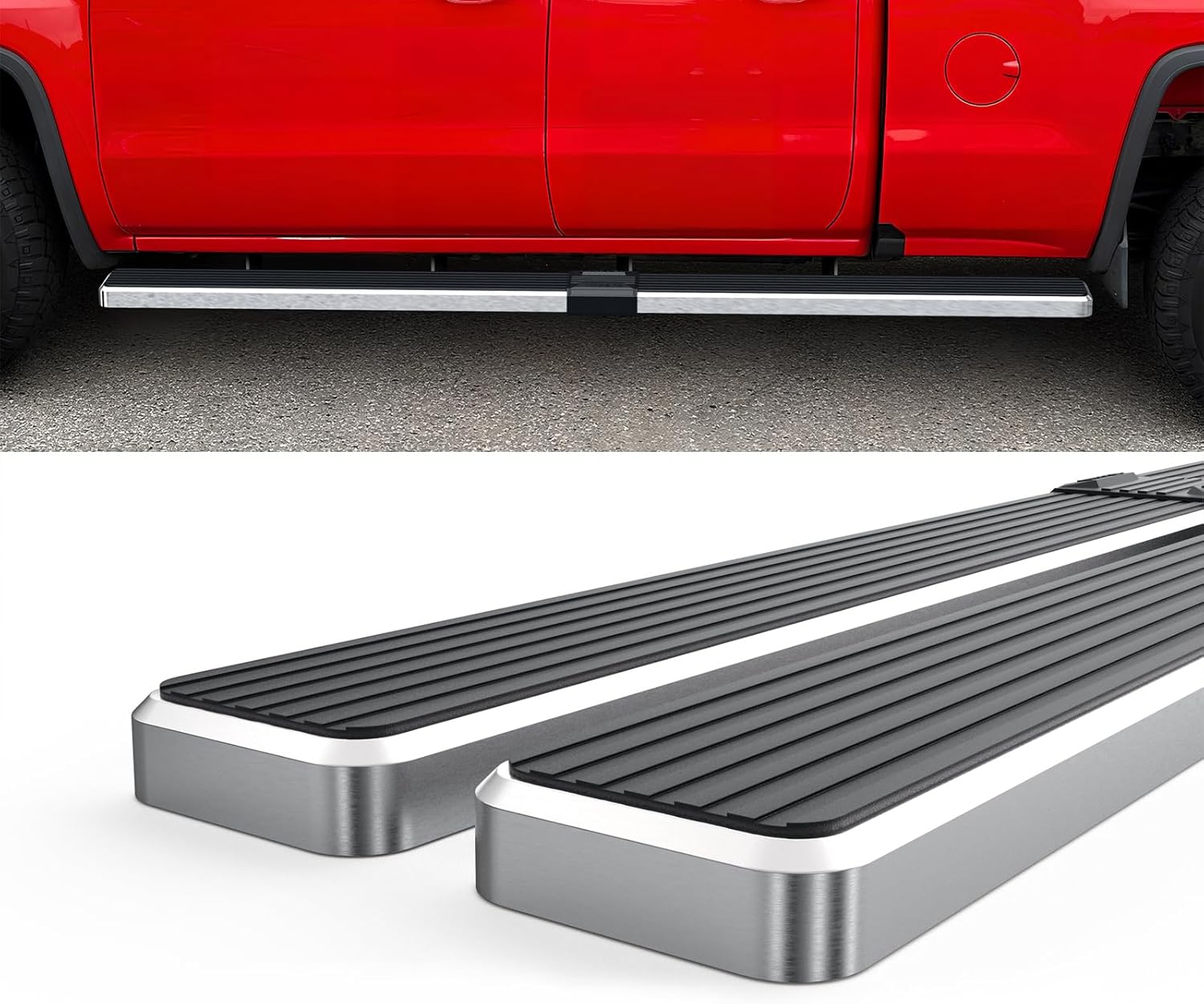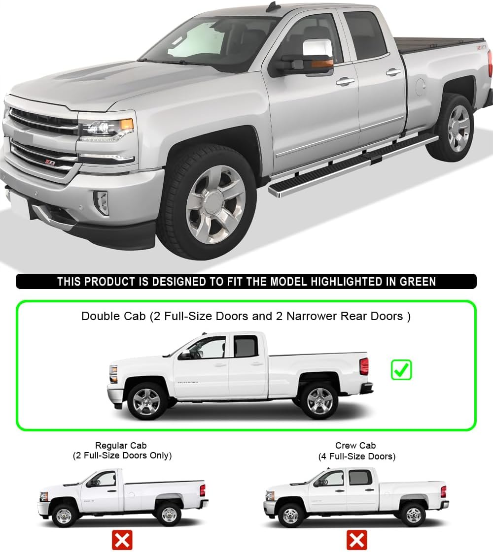 Fitments2007-2017 Chevrolet Silverado / GMC Sierra 1500/2500/3500 Extended Cab 6.5ft BedIntroductionWheel to wheel running boards provide easy truck bed access to longer wheel-base pickup trucks. These running boards span front to rear wheel, whereas other side steps are just door to door length. eBoard running boards are custom fit and install bolt-on style to your truck's frame or rocker panel (applications vary). eBoards have a simple, low profile design that put bulky and over styled nerf bars to shame. The eBoard's aircraft grade aluminum body supports up to 500 lbs without flexing. With a full length, non-slip step pad, these running boards offer a safer and more comfortable step for passengers and drivers alike. Available in 4, 5, or 6 inches, and finishes in brushed or powder coated black, eBoard running boards are a top choice for your family!SpecificationMaterial: T6 Aircraft Grade AluminumFinish: Brushed Style: wheel to wheel running boardsInstallation: Bolt on installation, no drilling requiredItem OfferedSet (2) of running boards + brackets + hardware
