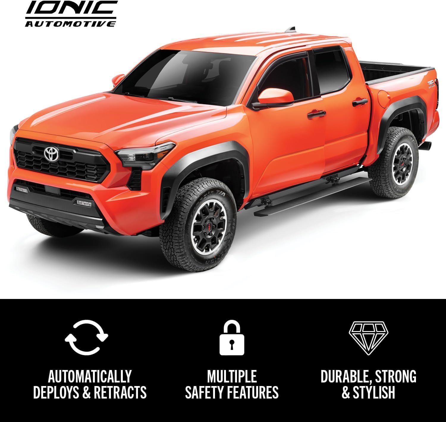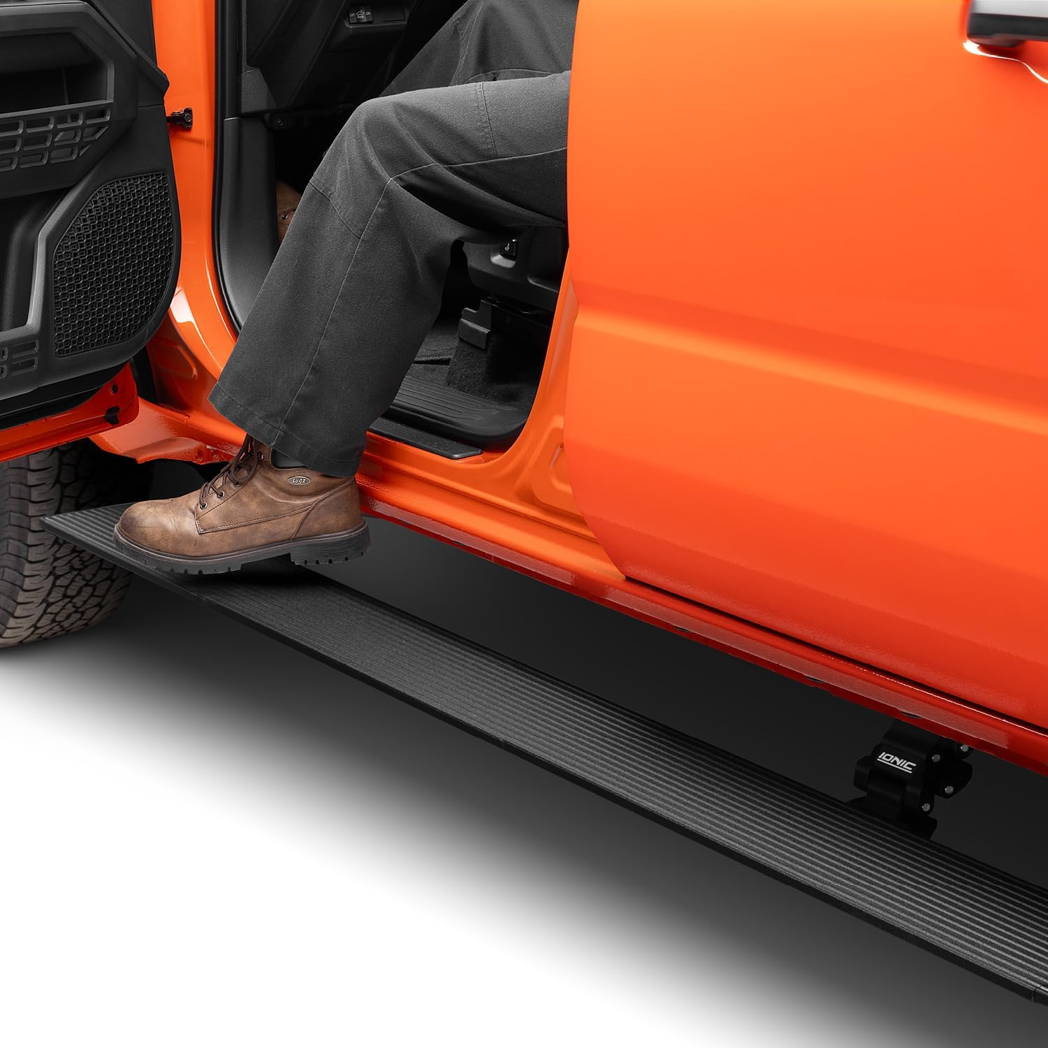 Ionic’s Electric Running Boards allow you to step in and out of your truck, Jeep, Bronco or SUV with ease. Open your door and the running board automatically deploys, providing a secure 6” wide durable aluminum running board with an anti-slip surface. Close your door and the running board automatically retracts, providing your vehicle with optimal ground clearance and protection for its rocker panel while preserving the look of your vehicle. With dual motors on each board, Ionic’s electric running boards are reliable even in extreme climates. The easy-to-install, magnetically activated door switches leave your OBD port free for other accessories. Automatic safety stops and manual override capabilities are included. Boards are finished with a Textured Black Powder Coat and have black nylon endcaps.