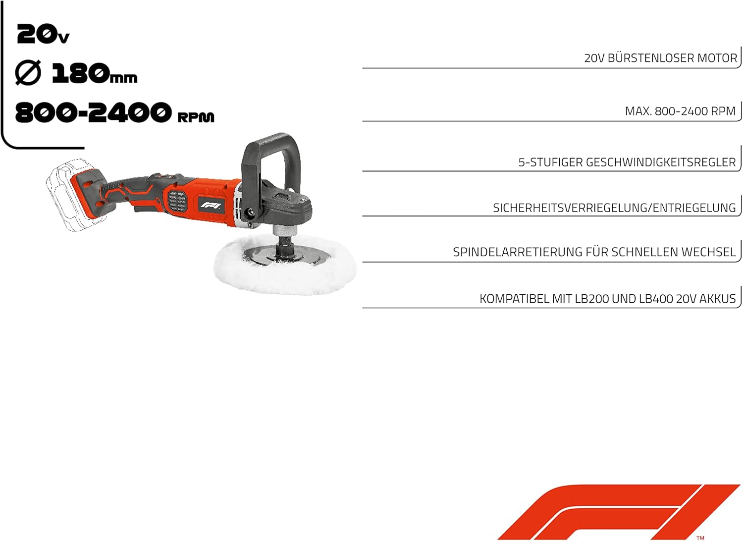 Formula 1® polishing machine PM 200. Constant performance and quality when reworking, waxing and polishing. Powerful brushless 20V Formula 1® motor with up to 2400 rpm. Five speed settings and soft start function for optimal results.