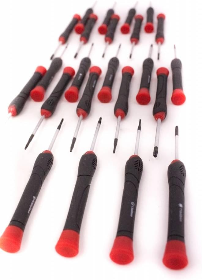 Product details: Number of tools: 23. Material: chrome vanadium steel. Blade shape: round. Blade tip surface: burnished Tool handle design: ergonomically shaped handle. Features: Twist cap. Screw head/nut profile: Phillips (PH), Pozidriv (PZ), slotted, hexagon, torx. Spanner width: PH.0000, PH.000, PH.00, PH.0, PH.1, PZ.0, PZ.1, SL 1.5 mm, SL 2 mm, SL 2.5 mm, SL 3 mm, SL 3.5 mm, HEX 1.5 mm, HEX 2 mm, HEX 2.5 mm, HEX 3 mm, TX T5, TX T6, TX T7, TX T8, TX T9, TX T10, TX T15. Packaging: in plastic holder