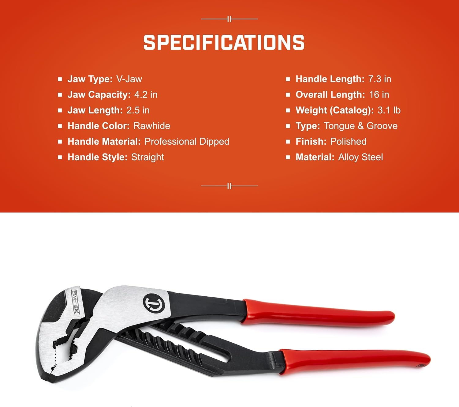 | Included Components | CRESCENT - Plier, 16", V Jaw, T&G, Dipped Handle (RTZ216V) |