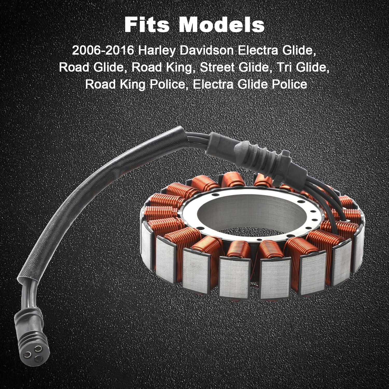 Stator Assembly For Harley Davidson 2006-2016 Touring all Models ★Direct Replacement to your original unit ★High Grade lamination ★High Grade copper winding, Resistant to 200 degrees Celsius ★Connector Include ★Rubber Grommet Include ★Easy Installation, Plug and Play If You Have Any Questions, Please Feel Free To Contact Us And We Will Try Our Best To Make You Satisfied