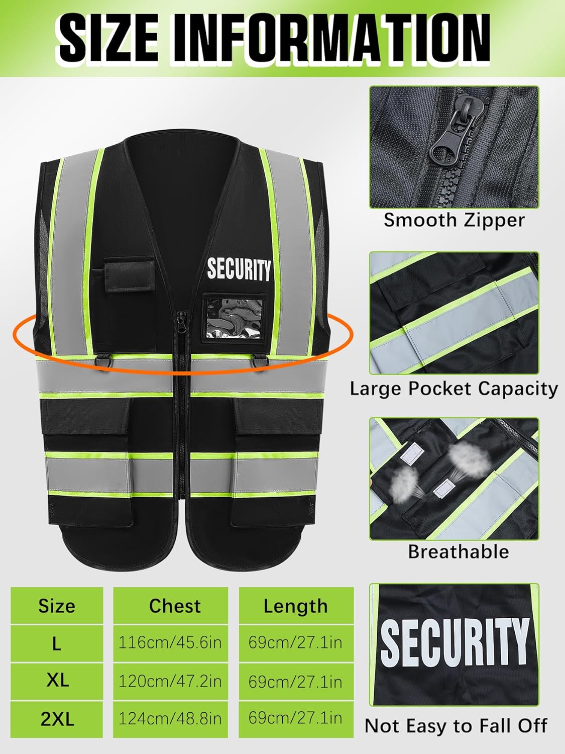 • Enhanced Visibility: stay conspicuous and increase your visibility with the 2.5 inches wide reflective strip and the reflective words [SECURITY] on the black reflective vest; This strip reflects light from various sources, making you easily noticeable, especially in low light conditions