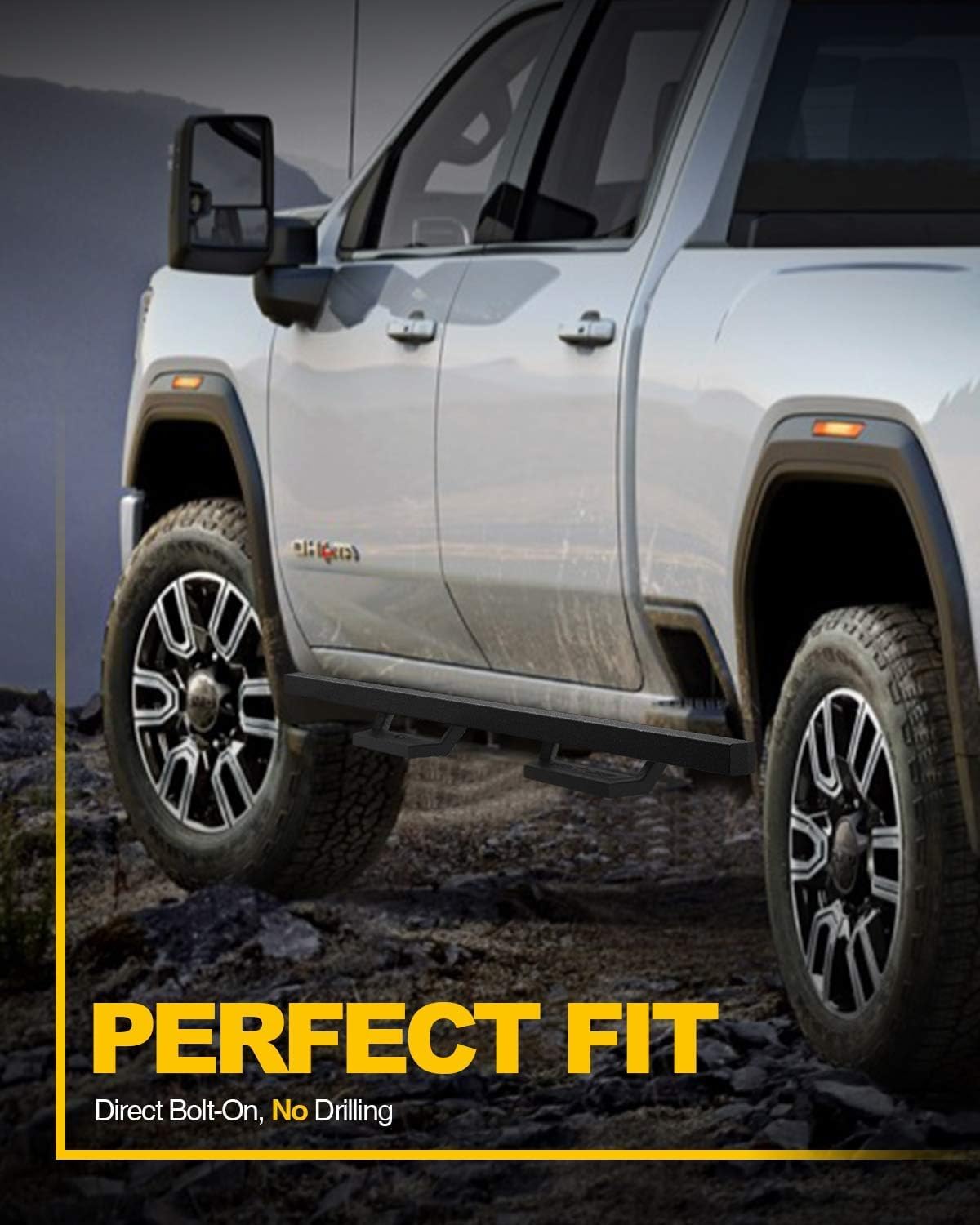 KYX Nerf Bars Running Boards Product descriptionWe use the latest industry standards and manufacturing experience to provide you with the best step pad exterior accessories. The truck Step Bars constructed from Q235A Black high-grade steel, Anti-corrosion, provides maximum protection for vehicle from damaging impacts.The KYX side bars provides dramatically improved access to the cargo hauling areas of larger vehicles, such as pickup trucks, lorry vans and trailers. Highlight Features: PATENTED Running BoardThis side bar, designed in the United States, is the latest side steps from KYX, and provides your vehicles with rugged protection and a unique appearance, so it not only looks great, but has real off-roading practicality.High Quality Made:High Quality Grade stainless steel Nerf Step features textured black powder coat finish. Waterproof, dust-proof, rust resistant, and extend the life of your boards even in the harshest conditions.Strong & DurableKYX side steps offer the best in collision protection, durability, above 500 pound load capacity.Strong Mounting Brackets, 100% welded construction creates a true 1-piece assembly that allows for the ultimate in strength, rigidity and durability, easy access and extra side protection to vehicleSpecifications:Material: Q235AColor: Black powder coatedPackage Contents:2 * KYX Running Boards1 * Mounting hardware set1 * Installation manualKYX ALL NEW SIDE STEP·Superior Design·Safe and stable·bolt-on installation·Super load-bearing·Easy to get on and off·No impact on traffic·Effectively protect your vehicle·Increase visual highlights to your vehicle