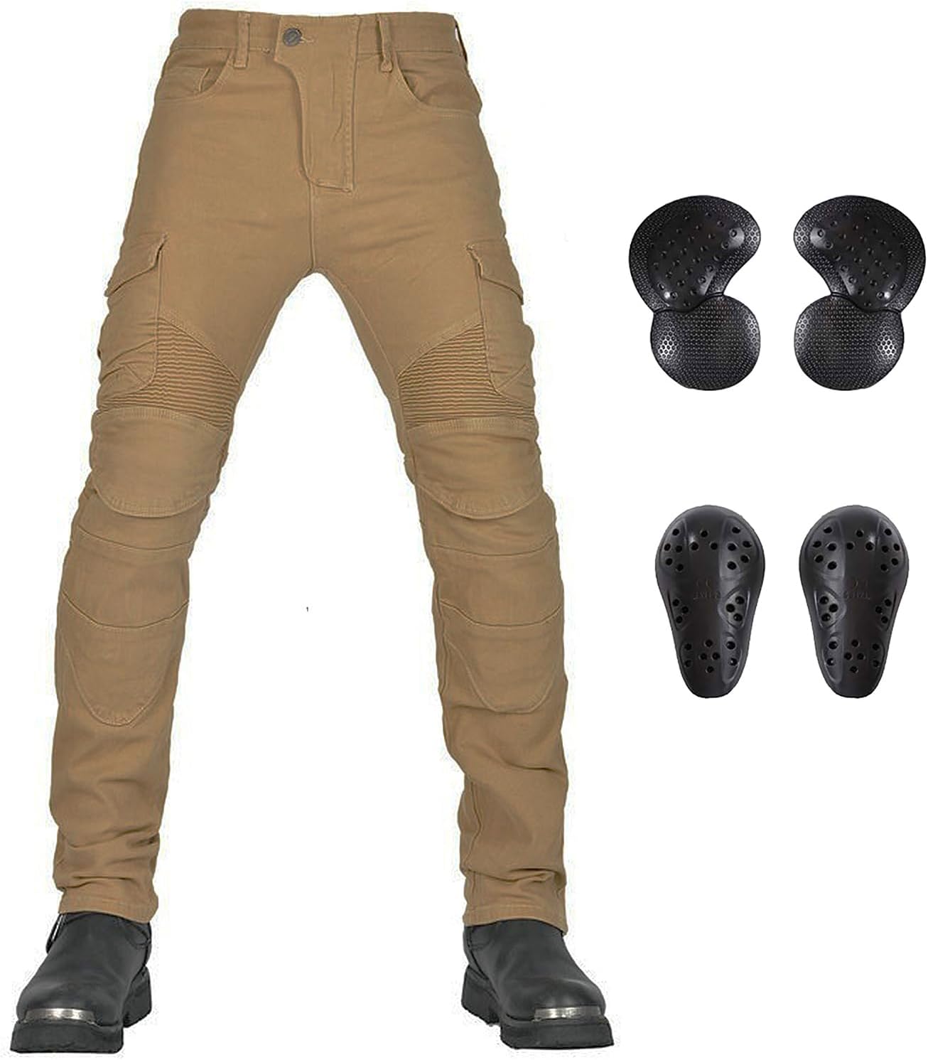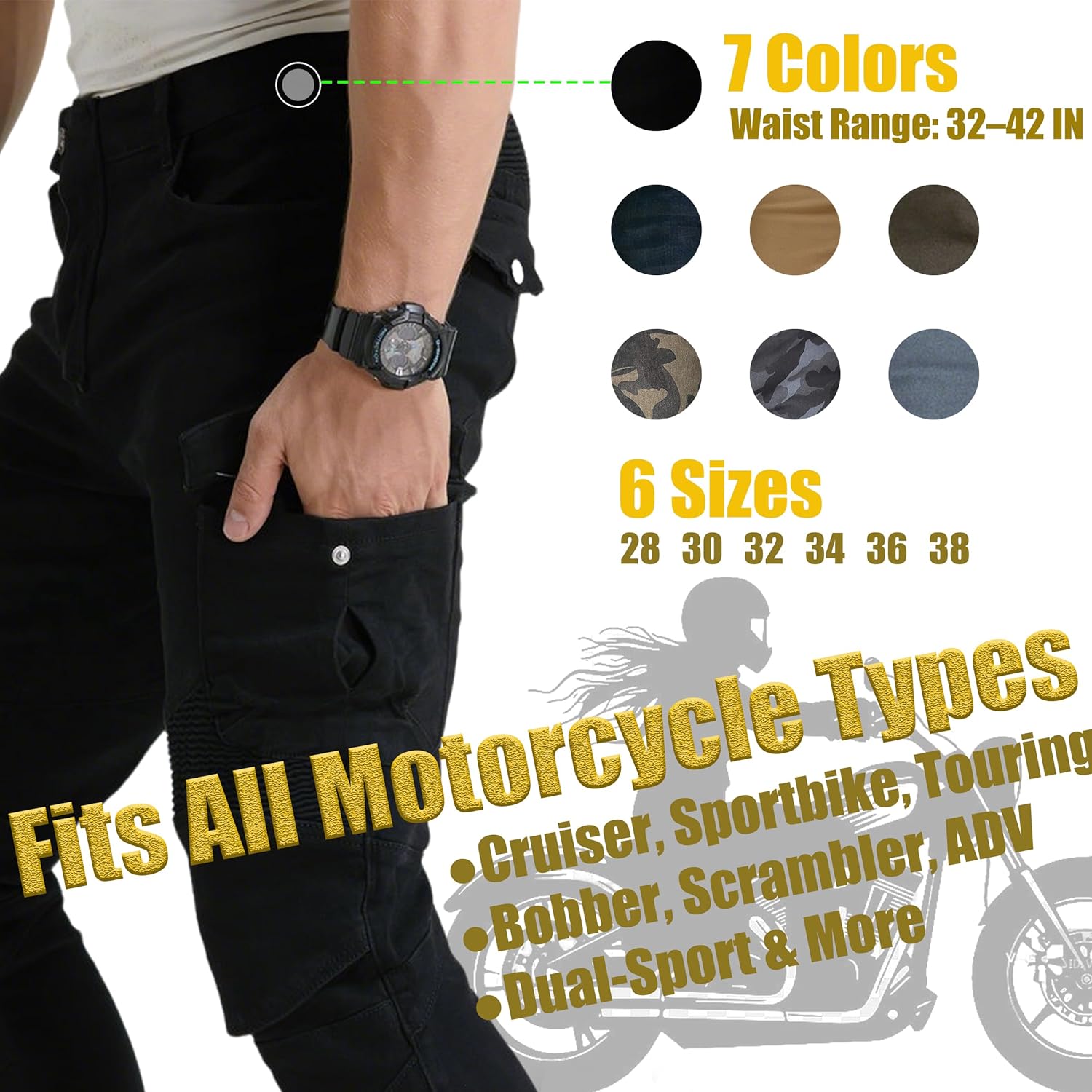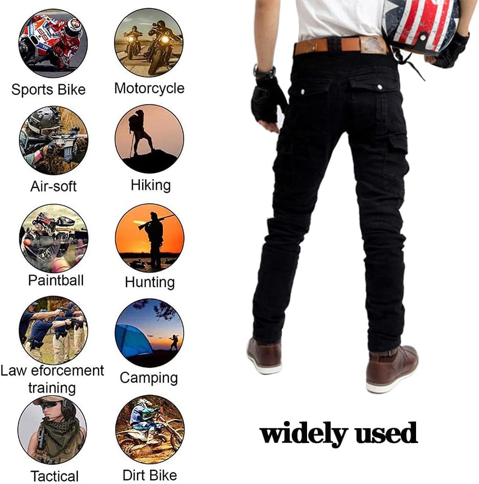 LOMENG Motorcycle Riding Jeans Biker Motorbike Pants with CE Removable Armored for Men Item Information: Material : Cotton, Polyester, Spandex Color : Military Green, Blue, Black, Camouflage, Khaki Size Information: 28/S =Waist Rec 32-33 inch, Waist 32.5 inch , Length 41.3 inch,Hip 38.5 inch,Thigh 22 inch 30/M =Waist Rec 34-35 inch, Waist 34.4 inch , Length 41.7 inch,Hip 40.5 inch,Thigh 23 inch 32/L =Waist Rec 36-37 inch, Waist 36.4 inch , Length 42.1 inch,Hip 42.5 inch,Thigh 24 inch 34/XL =Waist Rec 38-39 inch, Waist 38.4 inch , Length 42.5 inch,Hip 44.5 inch,Thigh 25 inch 36/2XL =Waist Rec 40-41 inch, Waist 40.3 inch , Length 42.9 inch,Hip 46.5 inch,Thigh 26 inch 38/3XL =Waist Rec 42-43 inch, Waist 42.3 inch , Length 43.3 inch,Hip 48.5 inch,Thigh 27 inch Please see the sizing chart for details. Why You Choose LOMENG Motorcycle Jeans? 1.Great value for money,durable,durable and sturdy. 2.You will receive a pair of waist and knee pads for free. 3.Breathable & Soft Denim Fabric Carefully selected for ensuring comfort while riding. 4.Motorcycle cycling pants come in various colors to choose from, which are fashionable, comfortable, and elastic. Note: 1.The dimension shall be measured in a flat state. Please understand the error of 1inch. 2.According to different monitors, the feeling of real objects, colors and materials may be different. Please understand. 3.This product is indigo dyeing product. In terms of characteristics, it will fade due to moisture, sweat, friction, etc. Please do not wash with other things. 4.Please use washing powder without bleach and fluorescent brightener. Please avoid prolonged immersion in water.