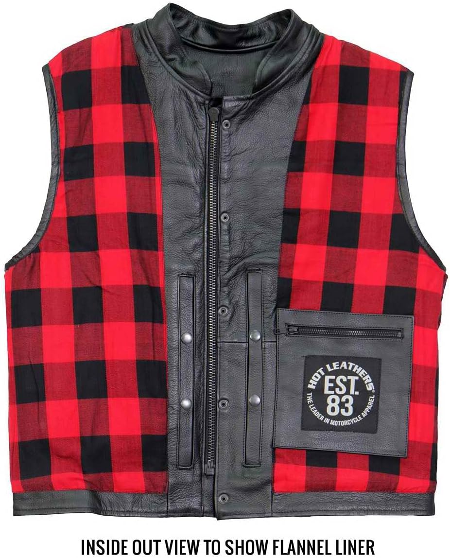 Hot Leathers VSM1060 Men's Black 'Flannel Red' Conceal and Carry Leather Vest Outside Features Made from Premium Heavyweight Cowhide Leather Stand-Up Collar Design Dual Zipper and Hidden Snap Button Closure 2 Outside Lower Hand Pockets with Zipper Closure 2 Chest Pockets with Hidden Snap Button Closure (Left Pocket Has a Slit for Your Eyewear) One Piece Back with No Seams Which Is Great for Club Patches or Embroidery Artwork Black Color Hardware Genuine YKK Zippers - Known for Longevity and Durability Inside Features Conceal Your Piece with Dual Inside Left and Right Storage Pockets (Can Be Used as Regular Pockets) Inside Right Storage Pocket with Zipper Closure Full Printed Flannel Red Inside Polyester Lining Ride Fast - Live Hard with Hot Leathers Apparel