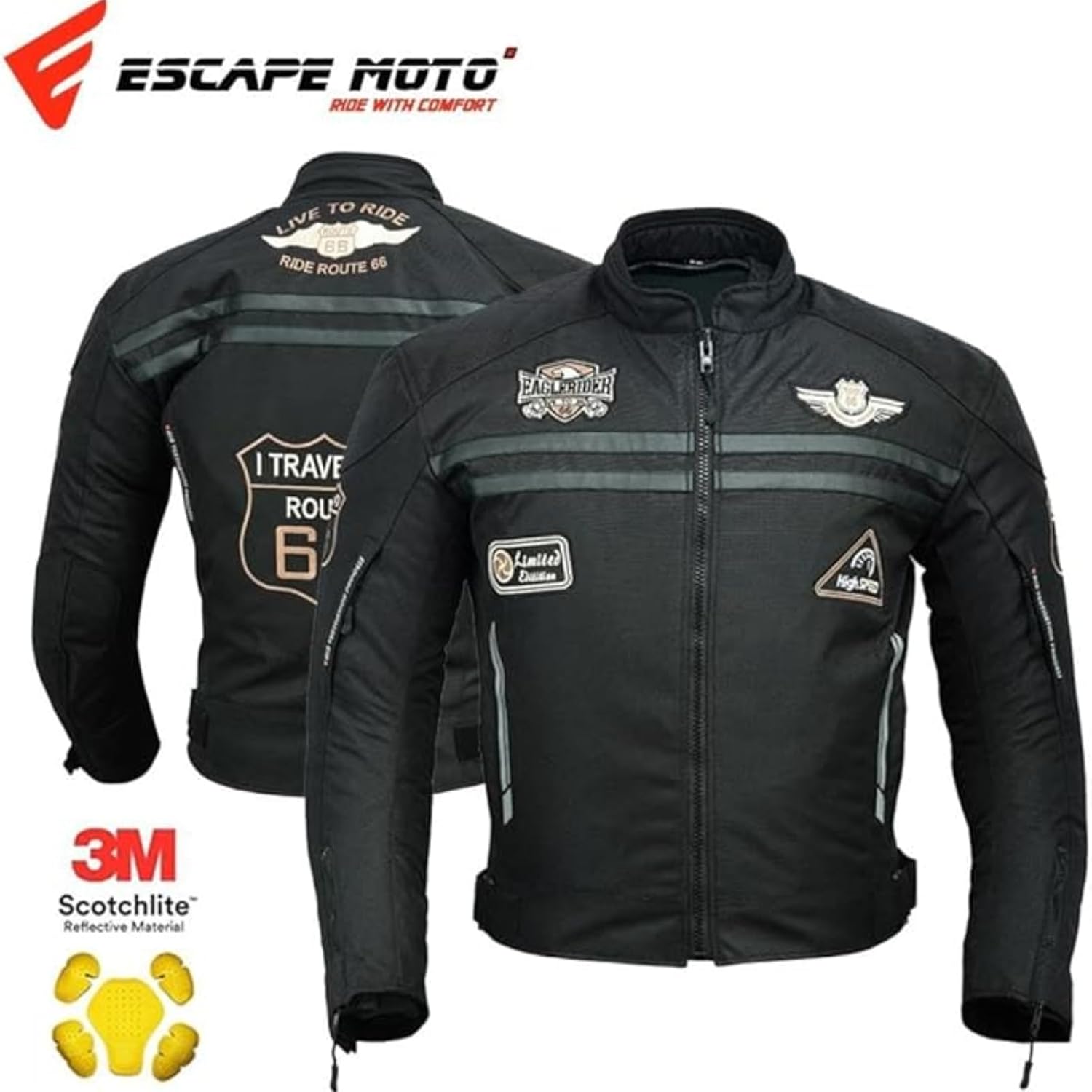 Experience ultimate protection and style with this premium motorcycle cruiser jacket. Crafted from durable Cordura fabric, this black jacket offers excellent abrasion resistance and waterproof capabilities to keep you dry in challenging weather conditions. The jacket features a sleek design with reflective stripes for enhanced visibility during night rides. Multiple zippered pockets provide secure storage for your essentials while on the road. The strategic placement of patches and emblems adds a classic biker aesthetic. With its robust construction and practical features like a high collar and adjustable cuffs, this jacket delivers both functionality and comfort for serious riders. The full-length front zipper ensures easy wearing, while the fitted cut reduces wind resistance during rides. Machine washable for easy maintenance, this jacket is designed to be your reliable companion for countless miles on the road. Perfect for daily commutes or long-distance touring, it combines safety features with contemporary styling for the modern motorcyclist.