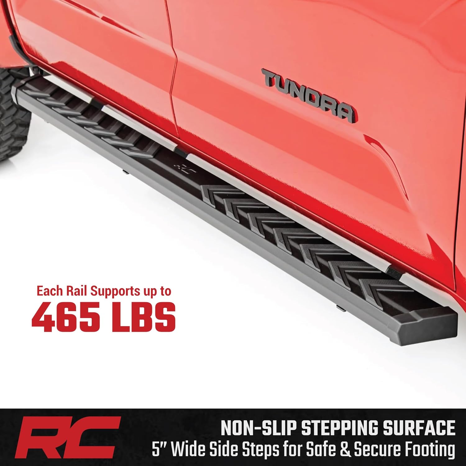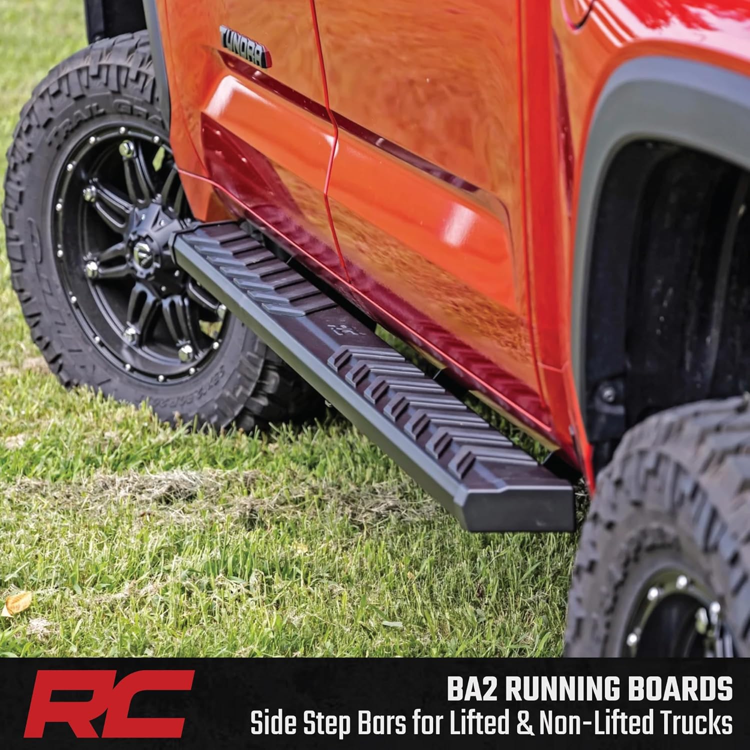 Ease of Access: Step into your vehicle with confidence using Rough Country's BA2 Running Board Side Steps. Designed for both form and function, these heavy-duty steel side steps offer a wide 5-inch stepping area, providing a secure and stable footing. A must-have for lifted applications, these steps enhance your vehicle's accessibility while delivering a rugged, off-road-ready look.Heavy-Duty Construction: Built to last, Rough Country's BA2 Running Board Side Steps feature a durable steel construction with a textured powder-coated finish for superior corrosion resistance. Rather than the narrow profile of typical round nerf bars for trucks, the 5" wide integrated nonslip stepping surface ensures maximum traction, even in wet or muddy conditions. Engineered to support up to 500 lbs., these steps are as strong as they are stylish.Hassle-Free Installation: Get back on the road quickly with a no-drill, bolt-on installation. Designed for a precision fit, these running boards install easily using standard hand tools in approximately 1-2 hours. No cutting, drilling, or modifications required - just a seamless upgrade for your truck or SUV.Built for Lifted Rides: Whether you're driving a lifted truck or SUV, these side steps provide a sleek, functional upgrade that complements your vehicle's rugged stance. Their aggressive design enhances both style and accessibility, making them the perfect addition for off-road enthusiasts and daily drivers alike. A must-have upgrade in truck steps for pickup trucks, these running boards add daily convenience, safety, and rugged style.5-Year Limited Warranty: Rough Country backs these BA2 Running Board Side Steps with a 5-year limited warranty, protecting against structural and workmanship defects. Drive with confidence knowing your investment is covered for years to come. Fitment Notes: Fits CrewMax models only, each side rail measures 85" in length.