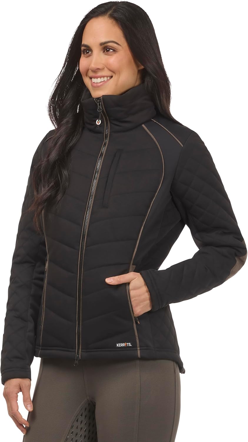 Meet your new favorite riding jacket— just like your trusted stablemate, it’s reliable and ready for any weather. The durable, wind and water repellent exterior is insulated with 180g poly-loft fill for superior warmth without bulk, while stretch panels ensure mobility. A two-way zip, plush-lined collar, and rider’s cut hem offer comfort in the saddle. Finished with faux suede piping, elbow patches, and multiple secure pockets for timeless equestrian style and function.