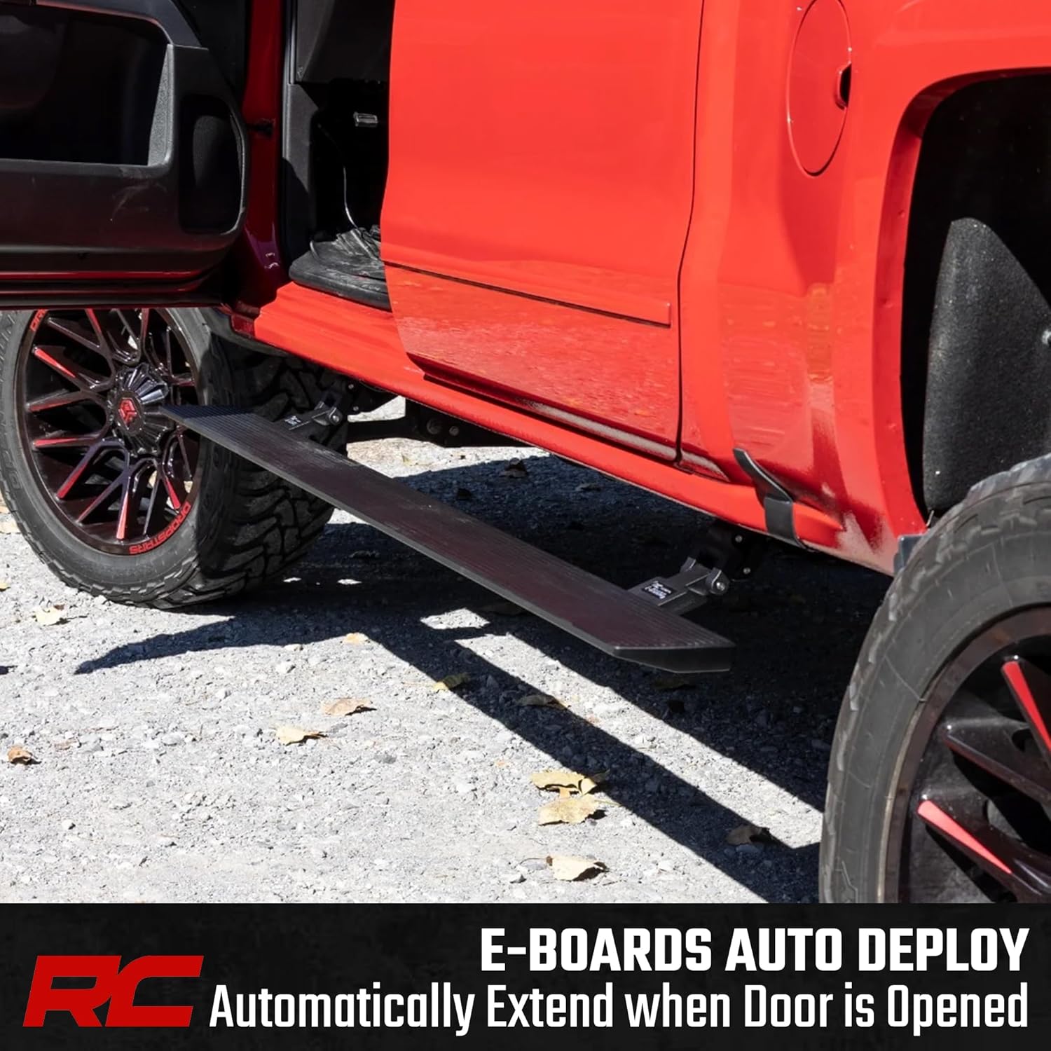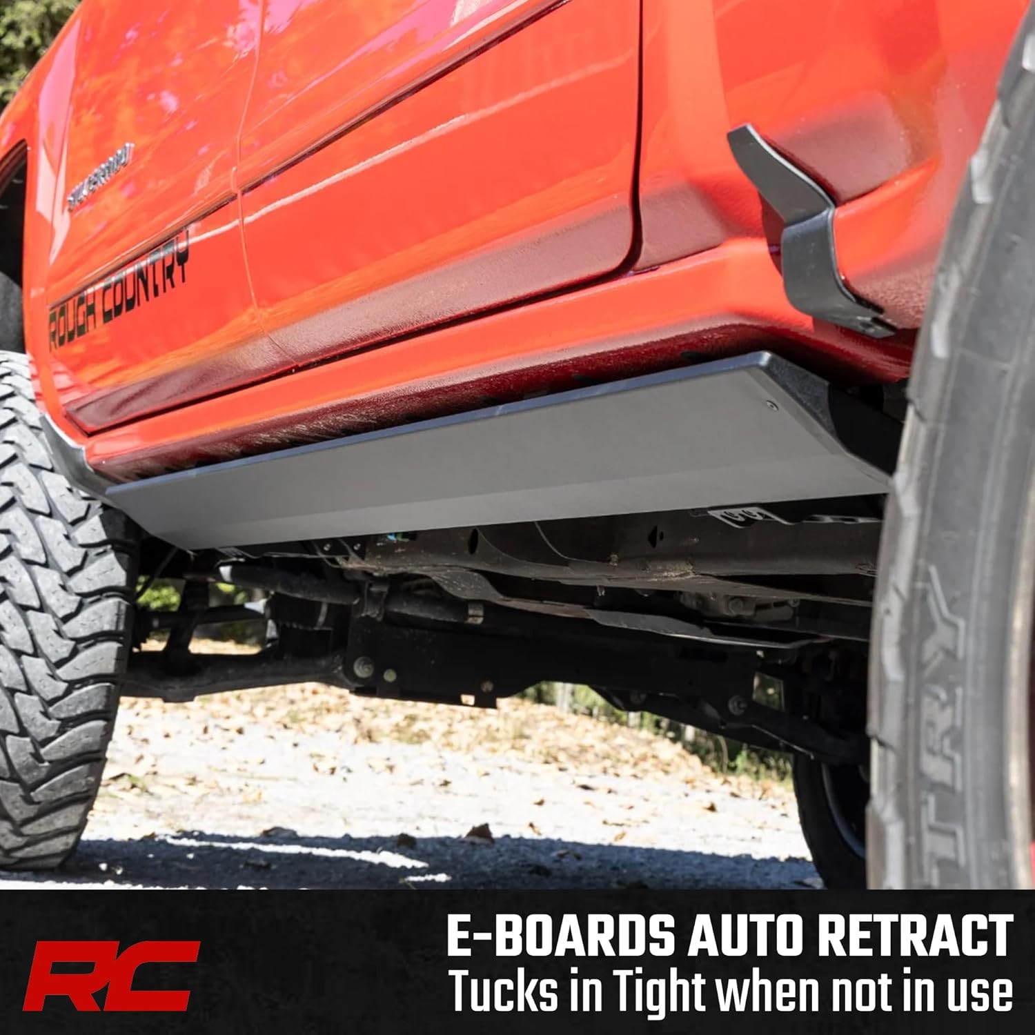 Step up in style. Sidesteps have come a long way, and now we've taken them to the next level with Rough Country's Power Running Boards! These retractable E-Boards tuck tight for a clean look when not in use and automatically extend when the door is opened. With an anti-slip surface that provides a secure stepping area, getting in and out of your ride has never been easier. Our Power Running Boards also include LED lights that provide illumination when deployed and shut off when steps are closed, providing a sleek, aerodynamic look. Premium Construction. The Rough Country E-Board Steps combine durability, strength, and style. These 6" all-season steps are made from lightweight yet durable aluminum and can support up to 660 lbs per side. Equipped with dual motor technology, these steps can handle anything Mother Nature throws their way. They feature an automatic 'SAFE-STOP' mechanism that engages if a blockage is detected and include an interior bypass switch for manual override. So whether you're heading out on a weekend errand or loading up for a camping trip, our electric steps offer reliable protection for all your adventures.Installation. These easy-to-install steps are the perfect solution for getting in and out of your vehicle. No drilling is required for installation, and the steps tuck tight under the rocker panel when not in use. Don't struggle to get in and out of your vehicle anymore. Make life easier with Rough Country's Power Running Boards.Warranty. Rough Country backs its products with a five-year limited warranty. Our products are protected from structural and workmanship damage after purchase. Our industry-leading warranty gives you peace of mind when using Rough Country products!FITMENT NOTES:Does NOT fit models with a DEF tank and ONLY fits Crew Cab GAS models; vehicles equipped with aftermarket traction bars may experience contact issues with the motor arm.