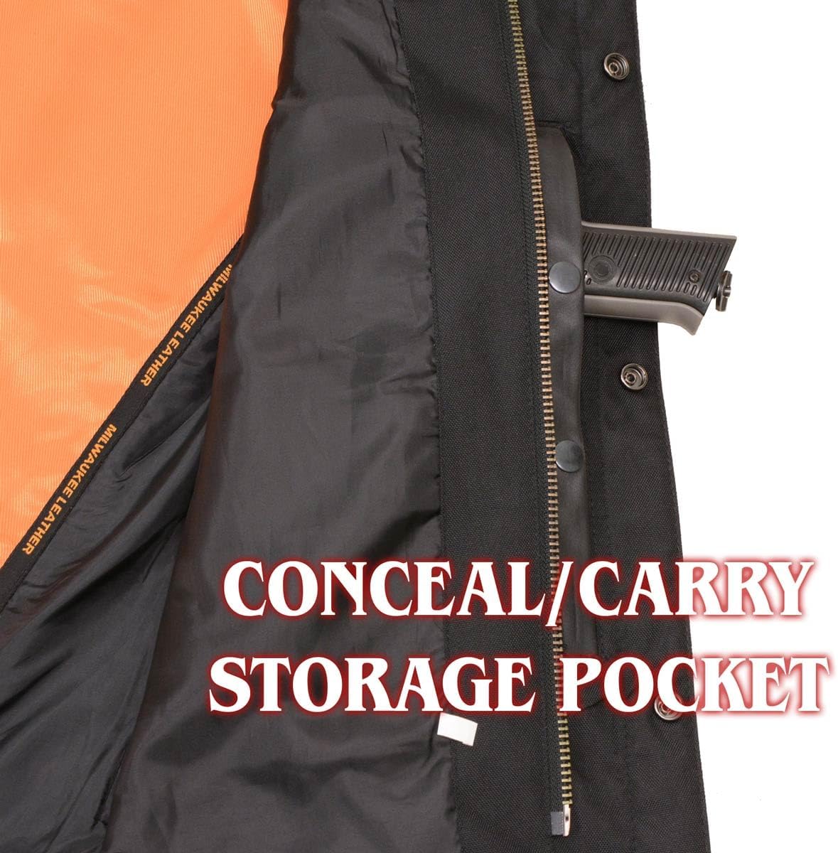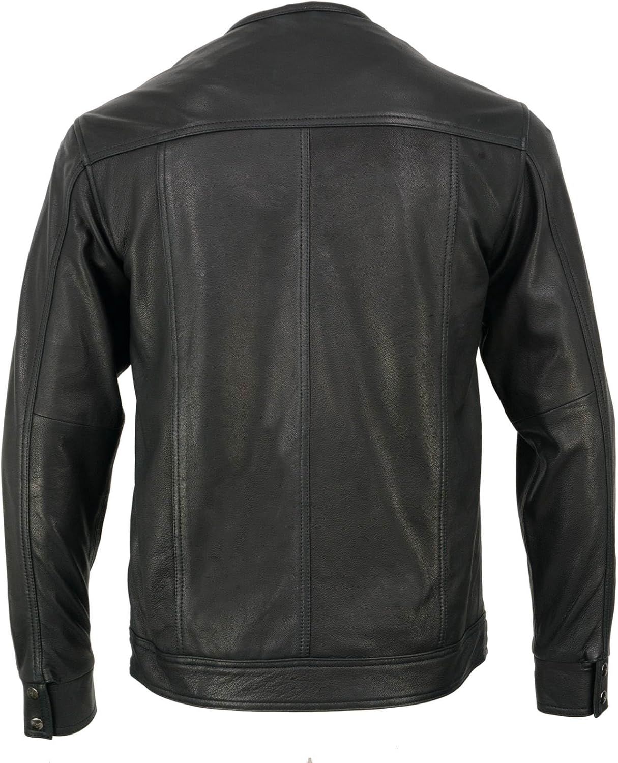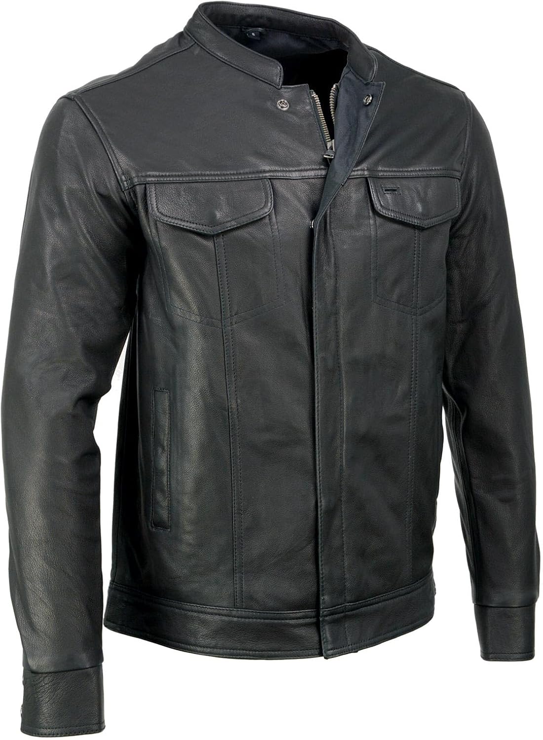 Milwaukee Leather MLM1607 Men's Collarless Black Casual Biker Goat Skin Leather Shirt with Dual Closure Naked Biker Shirt Our premium 100% leather motorcycle shirt jacket for men is crafted with high-quality full-grain 1.2-1.3 mm thick naked goatskin leather, providing superior protection and durability along with lighter weight. The leather strong construction ensures excellent resistance against abrasions, adding an extra layer of safety during your rides. Made from impermeable leather, our biker gear effortlessly blends style and comfort.Concealed Carry This biker shirt jacket is designed with concealed carry dual storage pockets. It features strategically placed pockets with secure closures, allowing you to discreetly carry your protection while maintaining a sleek and stylish look. Our shirt includes 2 front chest flap pockets, 2 outside lower drop handwarmer pockets with concealed snaps, allowing you to securely store and easily access small items like keys, wallets and additionally media pocket for phone. Snap and Zip Closure Our men's leather shirt comes with a hidden combination of snap and zip closures at the front, ensuring easy and swift wearing for a comfortable and secure fit. Additionally, the shirt jacket features full sleeves with cuffs that can be snapped shut, providing you the assurance to ride with confidence. The plus-size leather jacket available, from X-Small to 7X-Large, making it suitable for men of various sizes to stay protected while riding their motorcycles.Riders Shirt Jacket Our leather motorcycle riders shirt features a satin liner and collarless, crafted with durable leather material, making it an ideal choice for men on the road during spring, summer and fall. This lighter weight fashion motorcycle accessories have patch pocket on back and front with zip closure, which allows for customizable images and writings. It offers functionality and enhanced versatility in your wardrobe with this casual black biker gear for men. Versatile If you’re looking for a shirt jacket that will stand the test of time and stand out, then our real leather and lighter weight shirt jacket is an excellent choice, especially solo riders or riding club members. It’s versatile and functional, leather riding shirt jackets are essential staple to riding. As an investment, our top-quality leather shirt jacket can last a lifetime with great care.