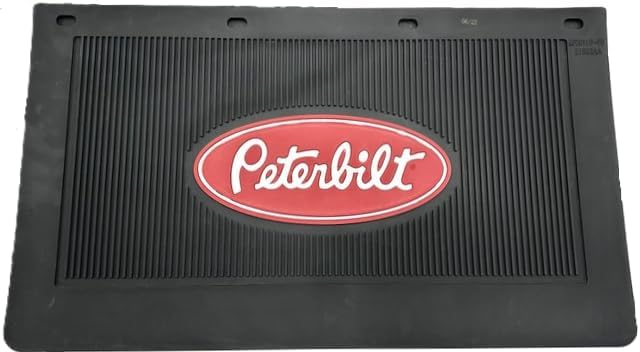 Protect your Peterbilt truck with these premium heavy-duty rubber mud flaps designed specifically for battery box applications. Each flap measures 24 inches by 14 inches and features the iconic red Peterbilt oval logo prominently displayed against a durable black background. The set includes two matching flaps with a professional-grade ribbed pattern that helps deflect road spray and debris effectively. These mud flaps are constructed from thick, industrial-grade rubber that stands up to harsh road conditions while maintaining their appearance. The battery box style design ensures proper fitment and coverage for your truck. The bold branding and quality construction make these mud flaps both functional and stylish additions to your Peterbilt truck. Easy to install and built to last, these mud flaps provide essential protection for your vehicle and other motorists on the road.