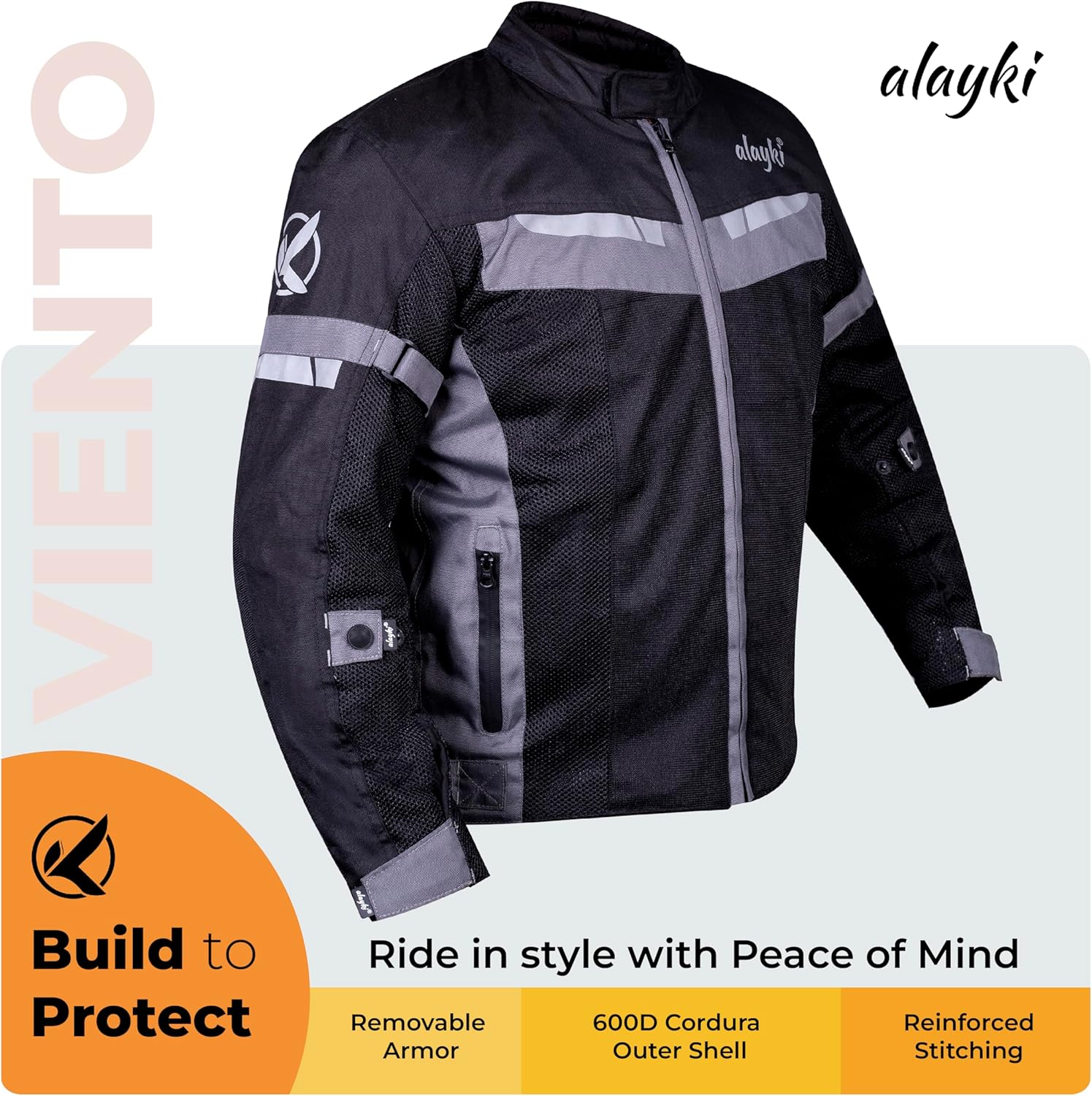 Alayki's Viento Mesh Summer Motorcycle Jacket: Ride Cool, Ride SafeIntroducing the Alayki's Viento Mesh Summer Motorcycle Jacket, your ultimate companion for beating the heat on two wheels. Named after the Spanish word for "wind," this breathable riding essential harnesses superior airflow and rugged protection to keep you comfortable and confident during the sweltering summer months. Whether you're a daily commuter navigating city streets or an adventure seeker tackling open highways, the Viento delivers premium performance without the bulk. Crafted for the modern biker who values style, safety, and ventilation, it's available in sizes S-5XL for a tailored fit that moves with you.Engineered for Unmatched BreathabilityStay cool under pressure with the Viento's innovative outer shell: tough 600D Cordura fabric integrated with micro and macro mesh panels (small and large perforations) for exceptional 360-degree ventilation. Air flows freely from chest to back, wicking away sweat and preventing overheating on rides where temperatures soar. The fixed mesh lining adds an extra layer of moisture management, ensuring your skin stays dry and irritation-free. No more sticky, stifling gear, this jacket lets the breeze do the work, so you can savor every mile.CE Protection You Can TrustRemovable Armor: High-density CE padding at elbows, shoulders, and back absorbs impacts while allowing full range of motion.Reinforced Durability: Double-stitched seams at elbows, shoulders, and high-wear zones guard against tears and abrasions.High-Visibility Design: Bold reflective strips on arms, shoulders, and back shine in low light, enhancing your presence for safer rides day or night.Protection doesn't have to mean restriction. The Viento balances lightweight agility with serious safeguarding, making it ideal for aggressive cornering or unexpected gravel surprises.Adjustable Comfort for All-Day RidingOne size doesn't fit all riders, which is why the Viento features intuitive adjustability: adjustable waist strap (up to 5 inches), Velcro cuffs, wrist straps, and bicep cinches for a snug, customized fit. The soft, neoprene-lined collar gently hugs your neck, eliminating chafing on long hauls, while the extended cut provides extra coverage without bulk. Pair it effortlessly with Viento Moto pants using the integrated connection zipper for a seamless, full-body system that adapts to your style, loose for relaxed cruising or tight for sporty precision.Smart Storage That Keeps PaceNever let essentials slow you down. The Viento boasts a practical 5-pocket layout: two external waterproof zippered pockets (with sealed zippers to repel rain), and three internal options, a secure zip pocket for keys and cash, a dedicated mobile pouch for hands-free access, and a slip pocket for quick-stash items. High-quality zippers throughout ensure smooth operation, even with gloved hands, so your gear stays organized and protected, rain or shine.Why Choose Viento? The Rider's EdgeIn a world of generic gear, the Viento stands out with its blend of Italian-inspired design flair and battle engineering. It's not just a jacket; it's an investment in rides that feel as good as they look. Easy to care for, machine washable and quick-drying, it's ready for your next adventure whenever you are. Join many of satisfied riders who've ditched the sweat for superior summer style. Gear up with Viento and let the wind carry you forward.Technical Specifications FeatureDetails Outer Shell600D Cordura with Micro & Macro Mesh Panels ProtectionRemovable CE Armor (Elbows, Shoulders, Back) AdjustmentsWaist (5"), Cuffs, Wrists, Biceps VisibilityReflective Strips on Arms, Shoulders, Back Pockets2 Waterproof External, 3 Internal (Zipper, Mobile, Slip) LiningFixed Breathable Mesh CollarSoft Neoprene-Lined CompatibilityPant Connection Zipper Available in vibrant colors: Black, Blue, Green, Red. Sizes XS-5XL. Ride responsibly.