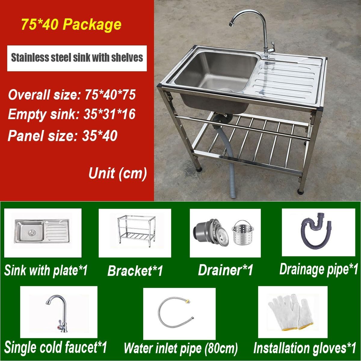 Product Information Name: Practical Kitchen SinkMaterial: 304 Stainless Steel Color: Silver Exterior :75×40×75cm/29.5×15.7×29.5inPanel Size: 35x40cm/13.7x15.7in Bowl Size: 35x31x16cm/13.7x12.2x6.3in Kitchen Sink Features: 1.Rounded corners-allows you to clean every corner, efficient and hygienic 2.Simple structure, easy installation-complete accessories3.Raised edges--prevent spills and spillsIncluding1xsingle bowl sink1xhot and cold water tap1xbracket1xdrain pipe1xwater inlet pipe1xangle valve1xall steel drain head1xinstallation gloves