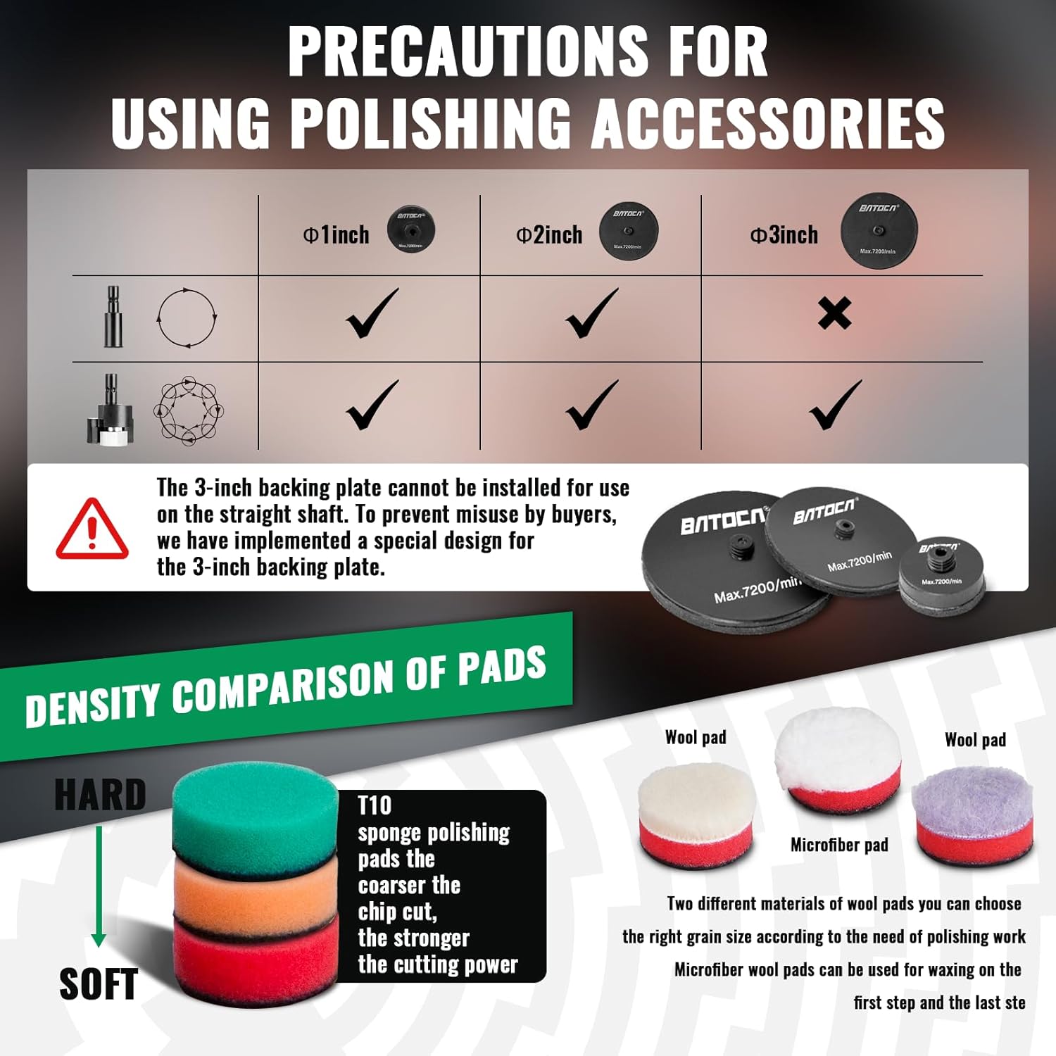 | Included Components | 1 inch/2 inch/3 inch backing plate and polishing pads kit, 2 pack batteries and fast chager, BATOCA S5 cordless mini polisher, microfiber towel and disposable glove and tool bag, wrench and straight shaft and eccentric shaft |