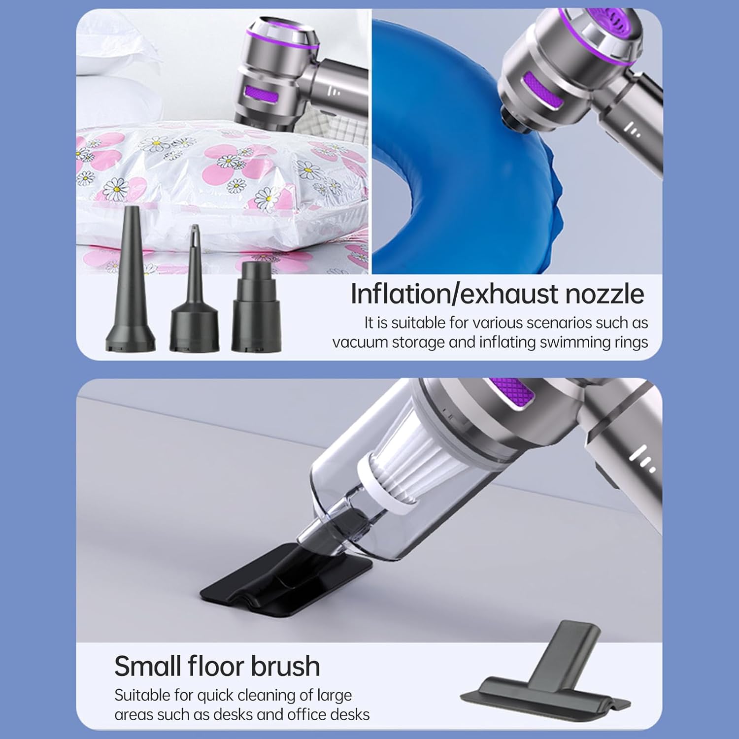 Car Vacuum Cleaner with Brushless Motor, 16000PA High-Power Mini Vacuum Cleaner, Rechargeable Handheld Vacuum Cleaner, Portable Compressed Air Duster Blower for Car and Home The mini vacuum cleaner is equipped with four functions: vacuuming, blowing, inflating and exhausting. Powerful suction, thoroughly clean every inch of space. Unique blowing design to cope with different cleaning challenges. Inflate swimming rings, etc. High-efficiency exhaust nozzle, easily solve storage problems. The powerful function of the vacuum cleaner collector makes dust everywhere have nowhere to hide, making all your items look brand new Portable design with rechargeable battery. This mini vacuum cleaner uses a 6000 mAh battery and supports Type C charging. It can be quickly fully charged in 4 hours with a 5V/2A adapter and can be used for nearly 30 minutes. Equipped with a TYPE-C charging cable, it can be charged with a USB slot in the car or anywhere at home Small and Lightweight: With a portable design, the mini car vacuum cleaner comes with an elegant storage bag that allows you to store all accessories neatly in one place. Easy Maintenance: With just one-click disassembly, you can easily dump the garbage and clean the vacuum cleaner. The HEPA filter can be washed and reused to ensure efficient suction while effectively blocking dust and dirt to prevent clogging. Product parameters: Battery: 2000mAh rechargeable lithium battery*3 (shipped with built-in battery) Working time: 30 minutes for low-speed vacuuming, 18 minutes for medium-speed, 12 minutes for high-speed Vacuum degree (fully charged): about 6000PA for low-speed, about 12000PA for medium-speed, about 16000PA for high-speed Rated voltage: 11.1V Charging method: type-C Motor: brushless motor Packing list: 1*car vacuum cleaner 1*EVA bag 1*type-C charging cable 1*instruction manual 2*filter element 1*hose 1*small floor brush 8*replacement nozzles
