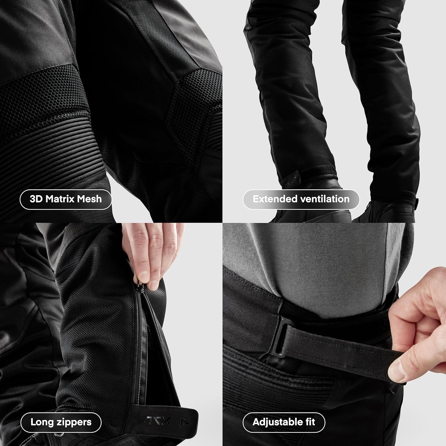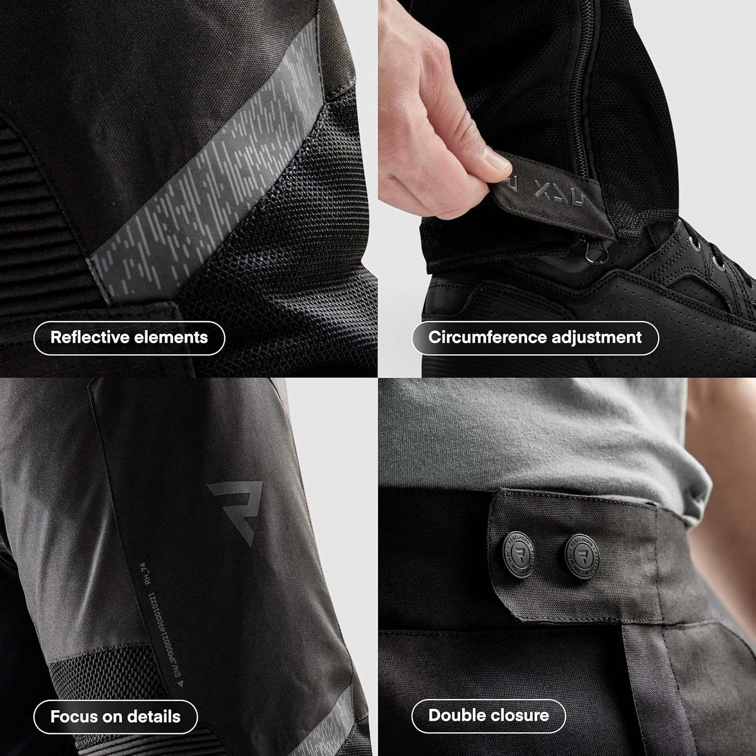 The Rebelhorn Men's Jax Motorcycle Pants are textile riding pants engineered for urban motorcyclists seeking reliable protection and all-weather capability. Designed with a 2-layer construction and ergonomic cut, these pants deliver safety features and riding comfort for dynamic street use. Built with a durable textile outer shell featuring integrated mesh ventilation panels for airflow during warm weather rides. The removable HUMAX membrane provides 10,000mm waterproof and 10,000g breathability protection against the elements. CE Level 2 certified armor protects knees and hips, with reinforced impact zones in critical areas. Reflective elements enhance visibility in low-light conditions. Pre-curved knees accommodate natural riding posture, while the adjustable waist enables customized fit. A short zipper connection allows secure attachment to compatible jackets. The ergonomic design supports extended riding sessions with multiple pockets for convenient storage of essentials. Large mesh panels work with the breathable membrane to regulate temperature across varying conditions. Available in sizes XS through 10XL to accommodate different body types. Key Features: CE LEVEL 2 ARMOR – Certified knee and hip protection with reinforced impact zones HUMAX MEMBRANE – Removable waterproof layer rated 10,000mm/10,000g breathability 2-LAYER CONSTRUCTION – Durable textile outer with mesh ventilation panels ERGONOMIC CUT – Pre-curved knees and adjustable waist for riding position comfort JACKET CONNECTION – Short zipper system for secure attachment to compatible jackets REFLECTIVE ELEMENTS – Enhanced visibility in low-light riding conditions EXTENDED SIZE RANGE – Available from XS to 10XL PFAS NOTICE – Contains PFAS chemicals for waterproofing and stain resistance