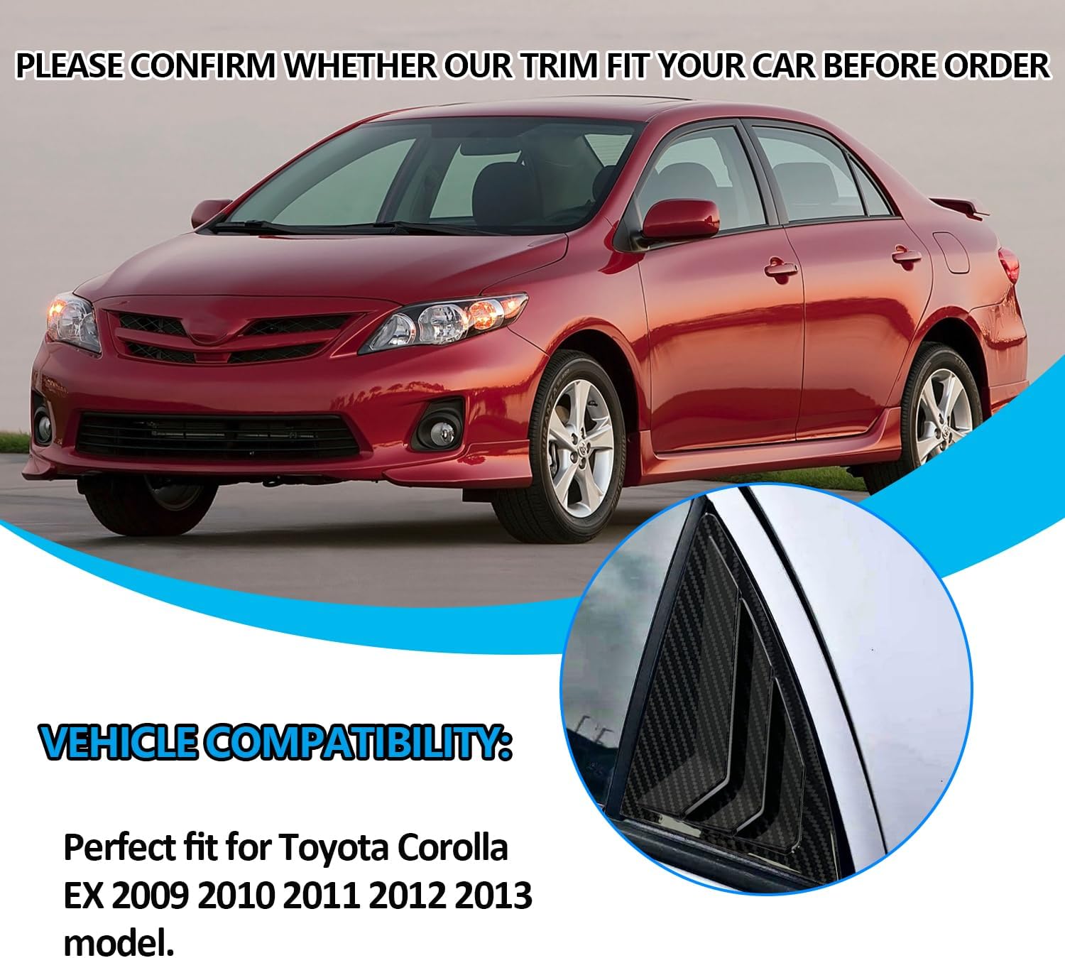 [Compatible information] The rear side window louver kit fits for Toyota Corolla EX 2009 2010 2011 2012 2013 models perfectly, can't fit for other model. [Product Parameters] Condition: Brand new Material&Color: High Quality ABS Material Bright Black (Carbon Fiber) Package Include: 2 PCS/SET(both sides) [model Feature] 1.Crafted with precision, these louvers are the perfect blend of style and functionality.Using this blind will give your car a sportier look. 2.The product is easy to install, convenient and does not damage the car body, and can be removed at any time without leaving any traces. The custom design ensures seamless integration with your car, making your car look cool and stylish. 3.Made of high-quality ABS plastic, it can cover existing scratches and prevent your car from being scratched by nails and keys. The material is hard, durable, corrosion-resistant, waterproof, and resistant to high and low temperatures. 4.They help protect your interior from the sun's harmful UV rays, prolonging the lifespan of your upholstery and dashboard. [Installation Step] *Step1: Please clean the surface of your car to make sure no dust and water. *Step2: Place the rear side window louvers on the place where it needs to be installed and adjust it well. *Step3: Remove the tape plastic film. *Step4: After the product is pasted, press hard for 1 minute to ensure full contact of the surface. Tips:Use a hair dryer to preheat the adhesive part of the product to enhance the adhesiveness of the tape.