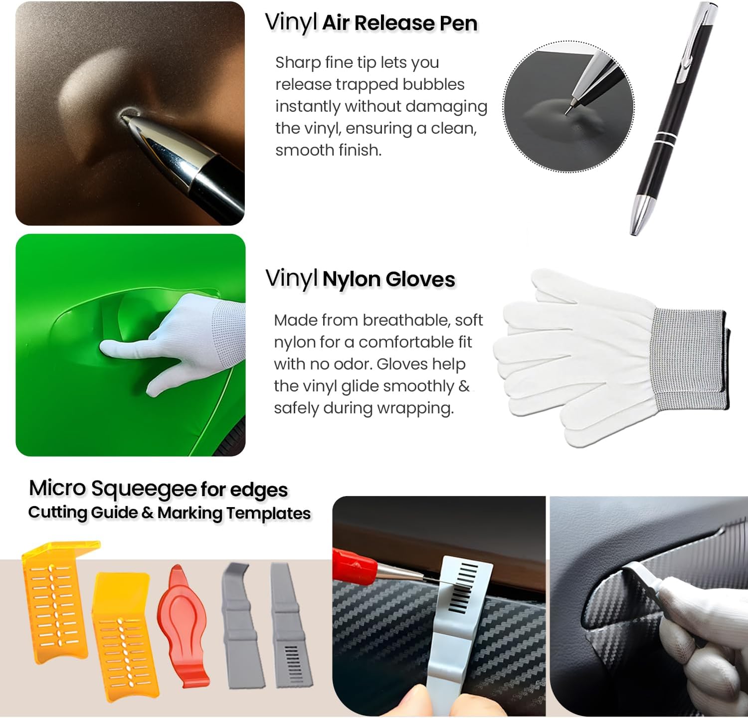 Complete Car Wrapping Tool Kit – Vinyl Wrap, PPF & Window Tint Installation Tools Get professional results with this Car Wrapping Tool Kit, perfect for both DIY vehicle vinyl wrap kits and professional installers. This all-in-one vehicle wrap tools kit includes everything needed for vinyl wrap application, window tint installation, and paint protection film (PPF) jobs. What’s Inside Vinyl Squeegee Set: Scratch-free car wrap squeegee felt for smooth vinyl and tint film application Contour Squeegee Vehicle Wrap: Curved edges fit bumpers and panels for window film installation and PPF application work Multi-Edge Pink Squeegee: Hard-edge tool for detail work and glue removal, ideal for vinyl wrap detail tools Magnet Wrap-Stick Squeegee and Car Wrap Magnets: Built-in magnets help hold film in place for easy alignment Micro and Mini Squeegees: Compact tools for DIY car wrap accessories and tight areas Vinyl Cutting Tools Kit: Includes safety cutter, craft knife, and trimming tools for precise film cuts Plastic Razor Scraper: Safe for removing residue from paint or glass PPF Squeegee and Wool Felt Scraper: Suitable paint protection film tools for dry or wet applications Vinyl Application Gloves: Lint-free gloves for smooth vinyl handling Air Release Pen and Vehicle Wrap Edge Correction Tool: Helps remove bubbles and fix curled edges Why Choose It All-in-one DIY car wrap accessories set for vinyl wraps, window tints, and PPF installations Suitable for vinyl wrap tools, window tint installation kits, and paint protection film tools Durable, professional-grade materials for clean, bubble-free finishes Ideal for car wrapping, vehicle graphics, and auto detailing Trayclicks helps you wrap smarter and faster with this complete Car Wrapping Tool Kit, a trusted choice for vinyl wrap tools, PPF application tool kits, and window film installation tools.