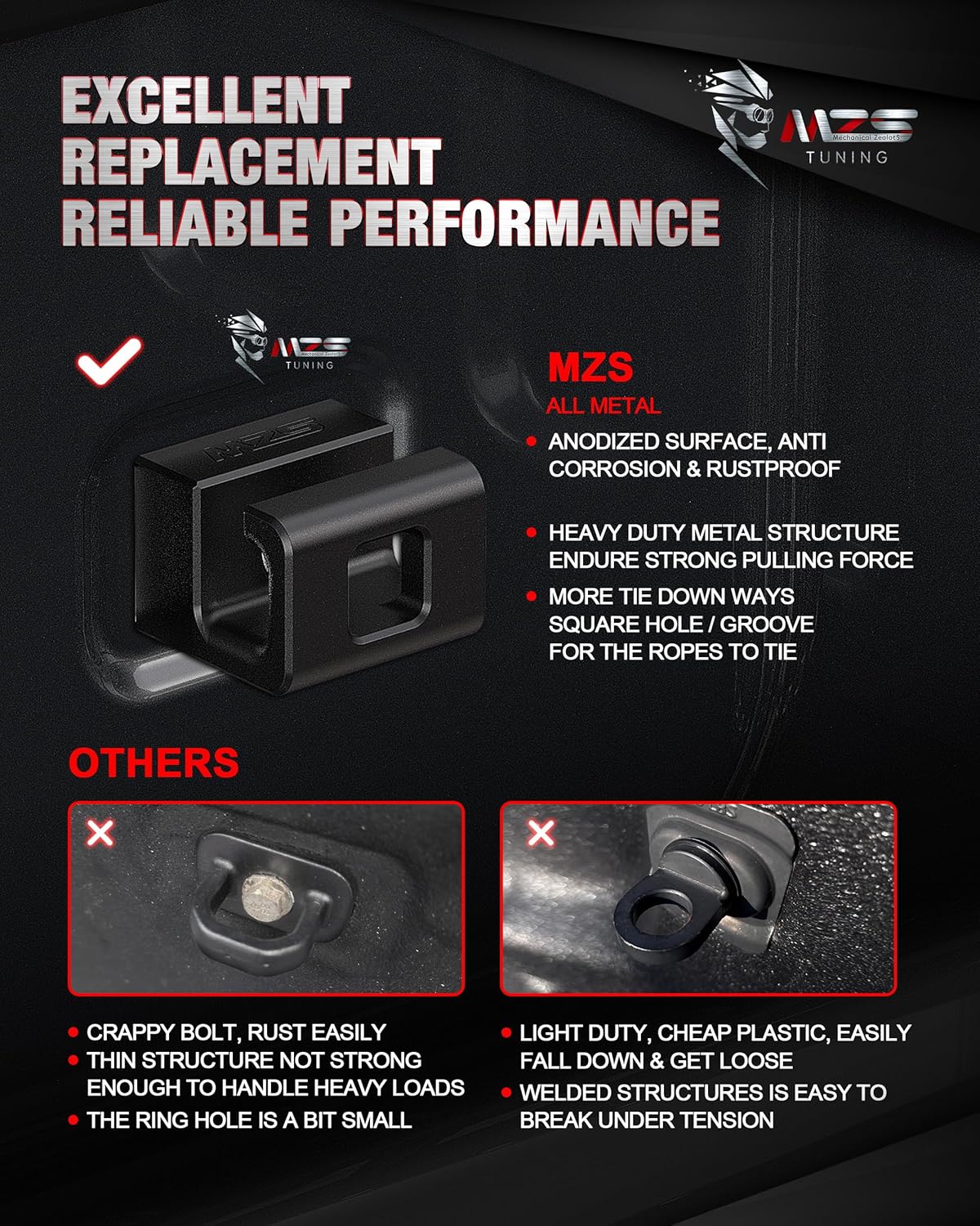 | Special Features | MZS tie down anchors are designed to maximize the versatility and convenience of truck bed, ensuring secure cargo fixation for safe and efficient transportation in various scenarios. This anchors can withstand strong pulling forces and protect valuables from movement, reducing swing and noise during transit. Equipped with hook opening for compatibility with diverse tie-downs, creating a robust clamping force for heavy-duty connections, making them an ideal solution for any transportation task. |