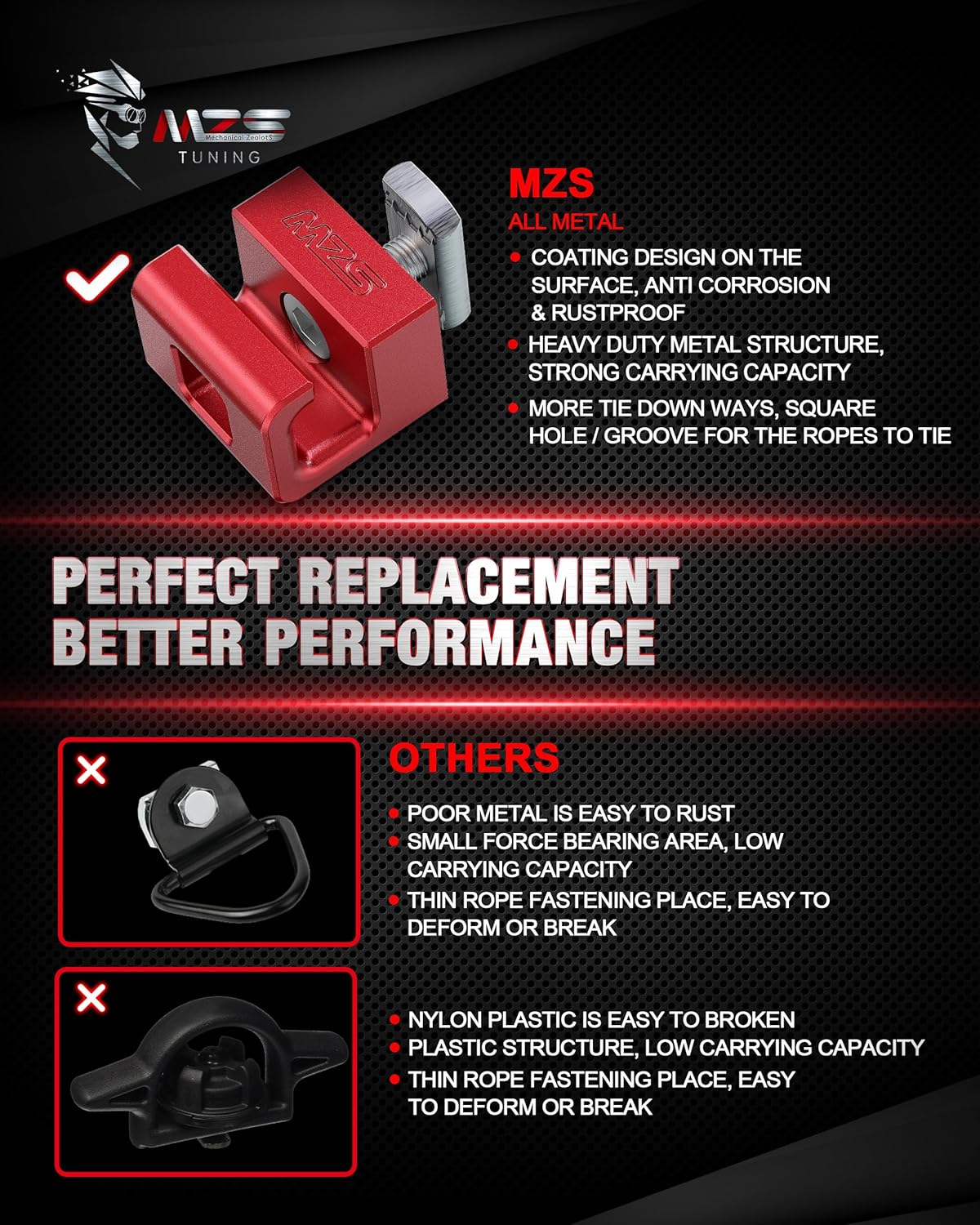 | Special Features | MZS tie down anchors are designed to maximize the versatility and convenience of truck bed, ensuring secure cargo fixation for safe and efficient transportation in various scenarios. This anchors can withstand strong pulling forces and protect valuables from movement, reducing swing and noise during transit. Equipped with hook opening for compatibility with diverse tie-downs, creating a robust clamping force for heavy-duty connections, making them an ideal solution for any transportation task. |