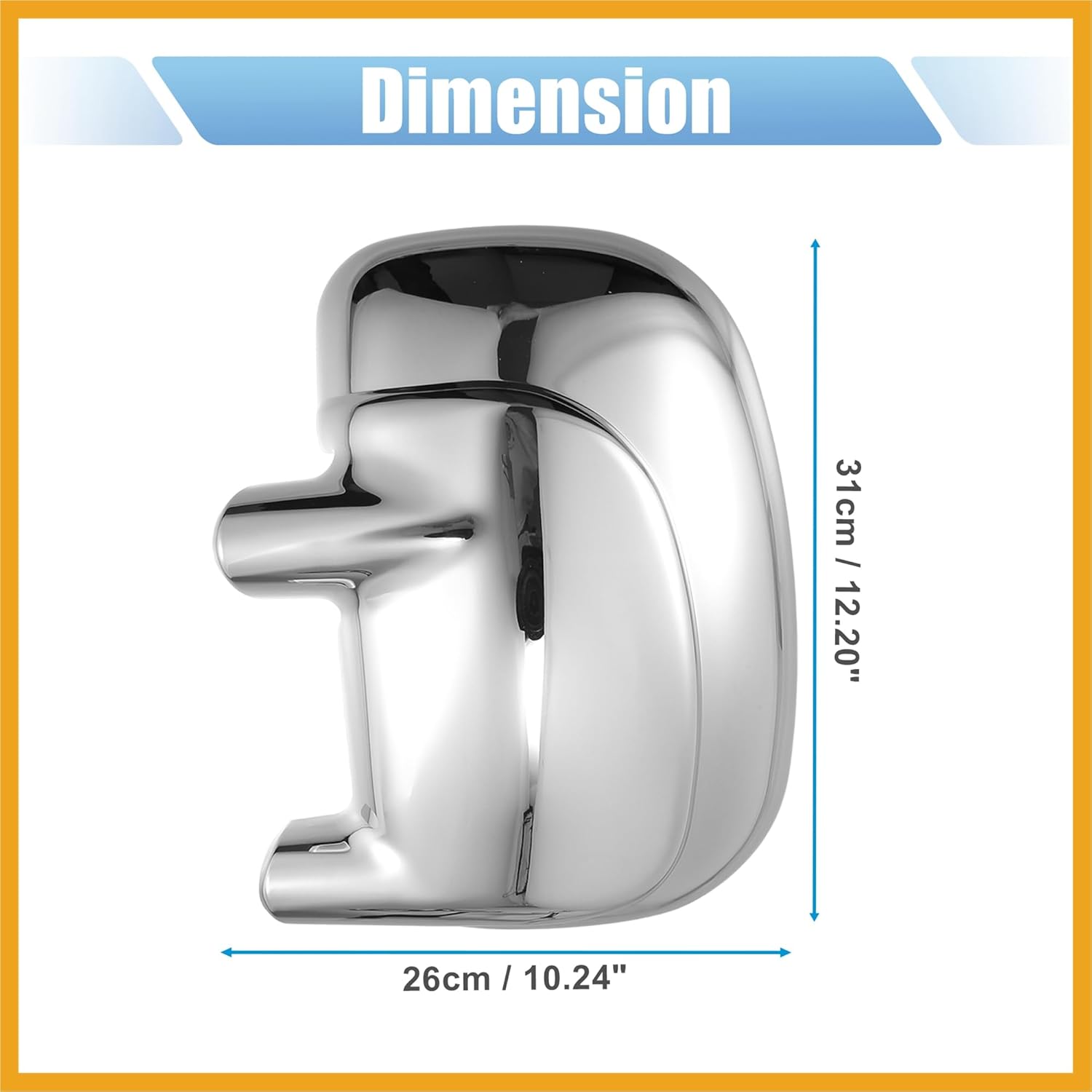 Features:Good fit your factory mirror cap and can also protect it from damage.Easy installation. Just peel and stick on the mirror, not a mirror cover/cap replacement. Firmly, not easy to fall off., and not easy to fade under any rigorous condition.Chrome patterned surface finish is a good decoration for your car.This is a non-OEM product, accessory only!Specification:Condition: Brand NewMaterial: ABS PlasticColor: Chrome ToneSize: 31x26x9cm / 12.20"x10.24"x3.54"(L*W*H)Fitment:for Ford F-350 Super Duty 1999-2007for Ford F-450 Super Duty 1999-2007for Ford F-250 Super Duty 1999-2007for Ford Excursion 2000-2005Note: confirm the product if it matches your car before you purchase.Package List:1 Pair Full Mirror Cover