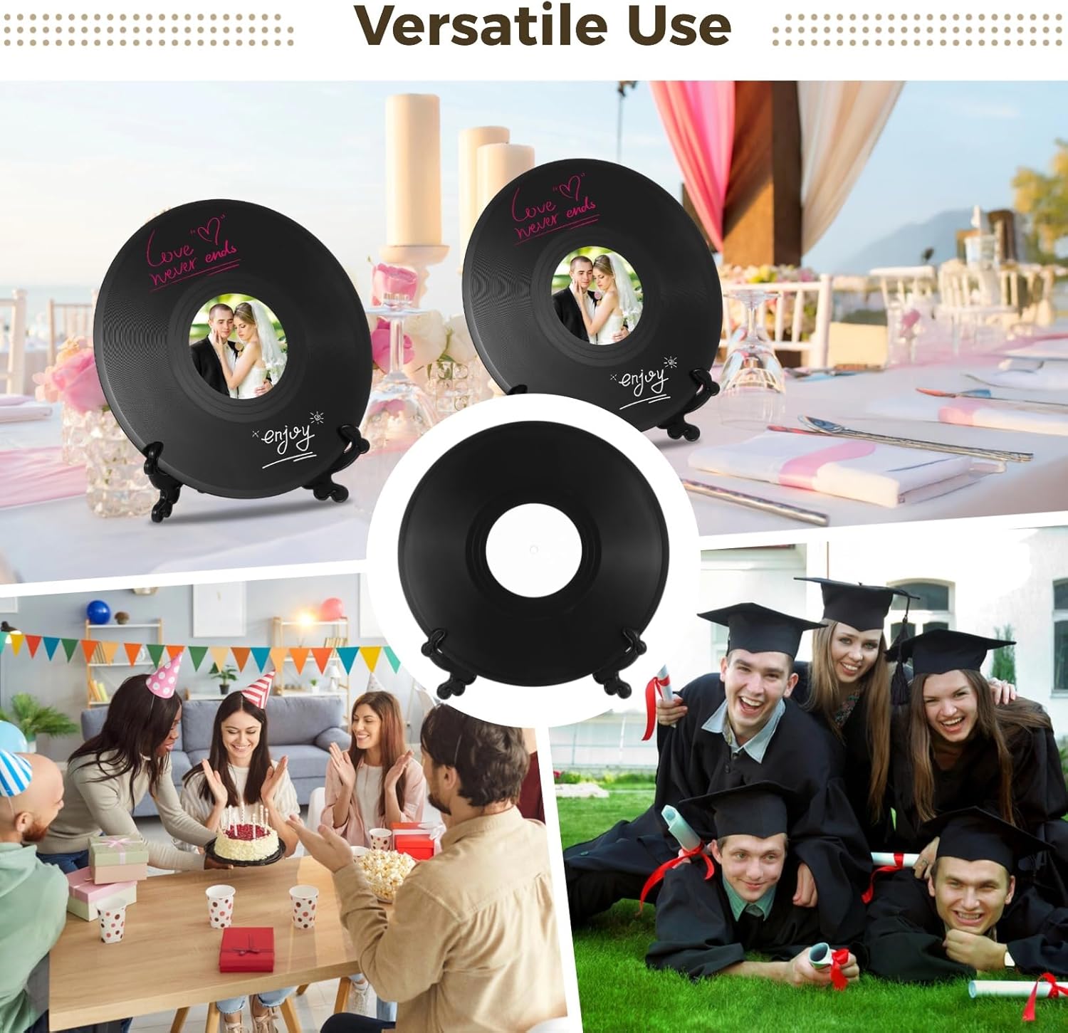 Color: BlackMaterial: PlasticSize: Vinyl Record: 11.81 x 11.81 in,Display Stand: 9.8 x 6.2 in,Printable Sticker: 4.2 x 4.2 in,Pen: 4 inPackage Includes: 4 x Vinyl Records,4 x Display Stands,12 x Pens,4 x Printable StickersNote:- Please refer to the measurement. Tiny measuring error is allowable in normal range.- There might be a little color difference due to the monitor, camera or other factors, please refer to the physical item.