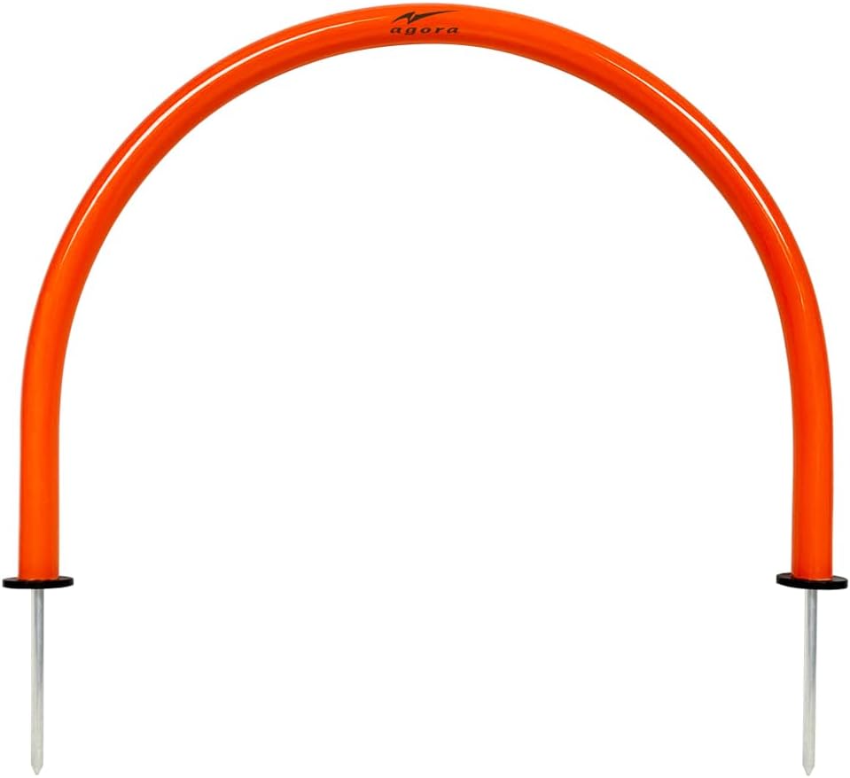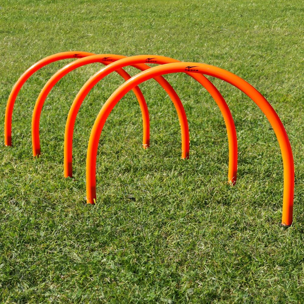 Sharpen your dribbling, accuracy & speed with this multipurpose training tool. Built-in spikes firmly secure it into the ground. Arches can be used for passing or dribbling drills, as speed hurdles and as small-sided goals. Non-shattering high strenght tube. Set of 4 - Orange. Inserted opening: 19" W x 14" H