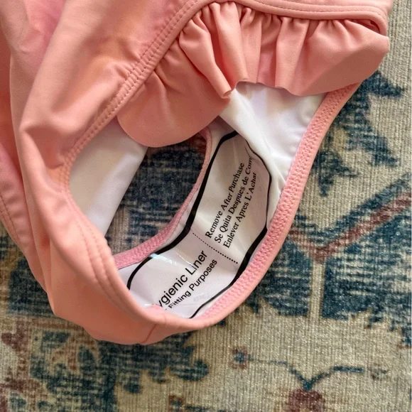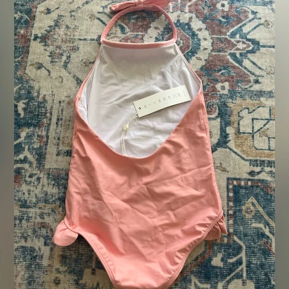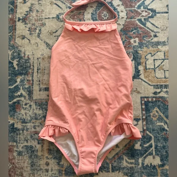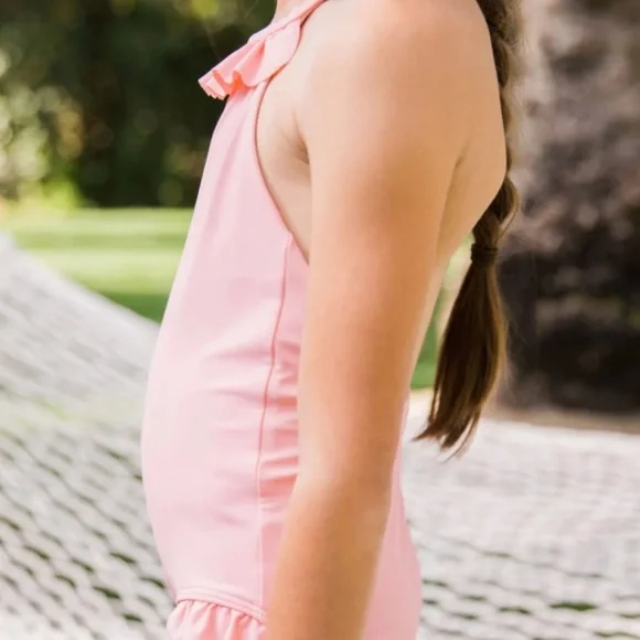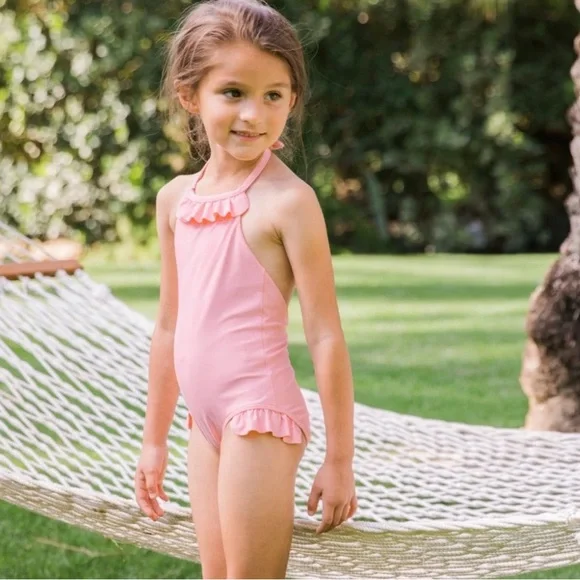Brand New, sold out!! an elevated take on a classic halter one-piece. we're excited to welcome a new silhouette for girls. with a chic high neck halter and our signature ruffle details, it's fresh but timeless. made with adjustable snaps and a fixed tie knot at the neck, it can grow with your girls. available in our sunny sorbet pink, its the perfect suit for warm days ahead.
