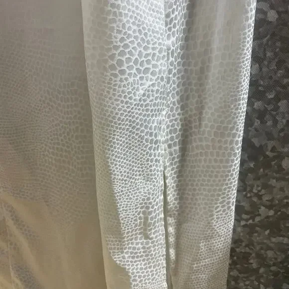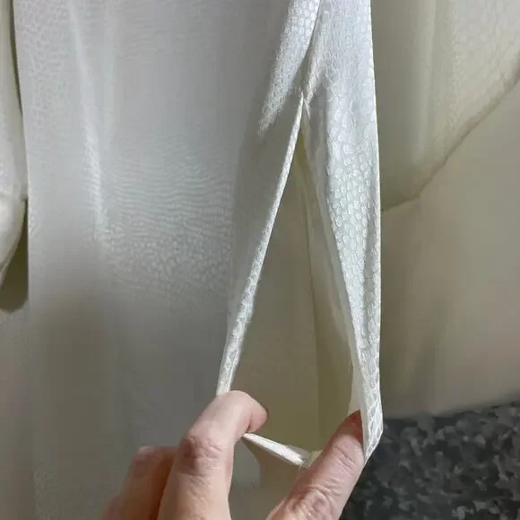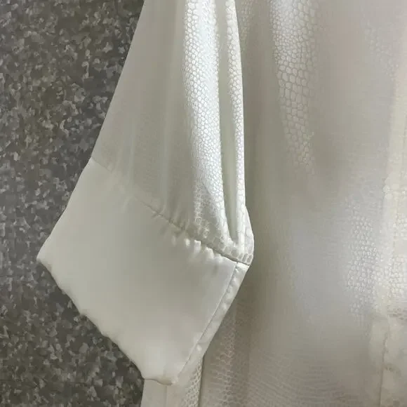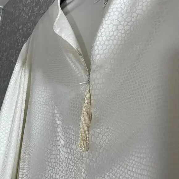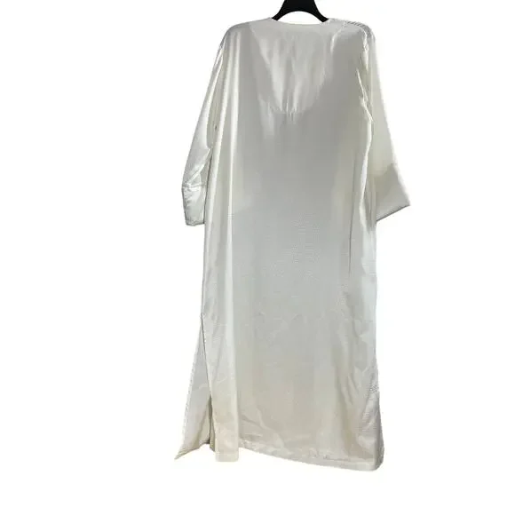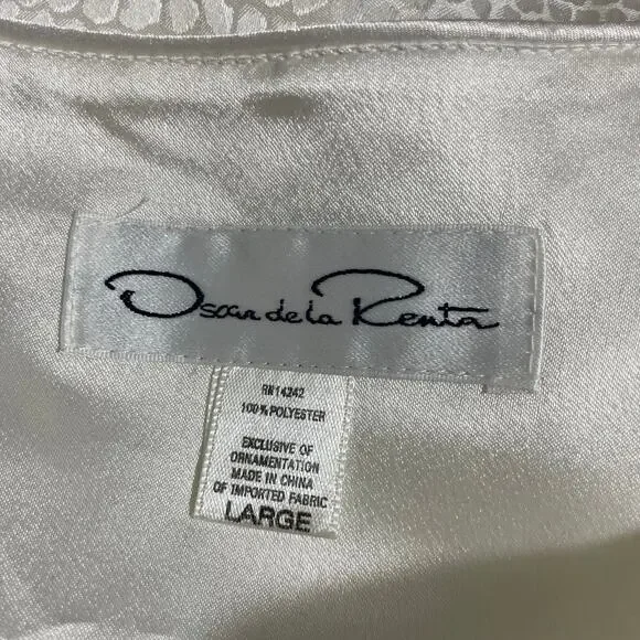 Women's vintage kaftan style dressing gown, robe, or long nightgown by Oscar De La Renta from the 1990's.This white nightgown has a pebbled texture, 3/4 length sleeves with padded hems, and a zipper at the neck with tassel.It is 100% polyester.The gown is a size large.When laying flat it measures approximately:Armpit to armpit: 24 inchesWaist: 48 inchesLength: 55 inchesThe dressing gown is in amazing vintage shape.