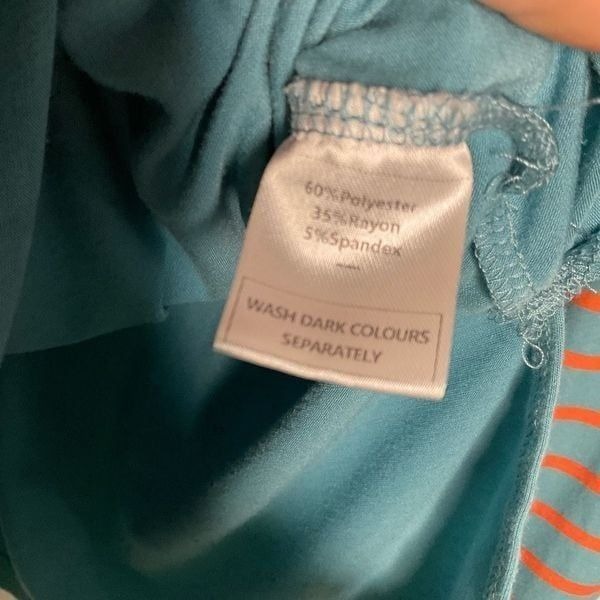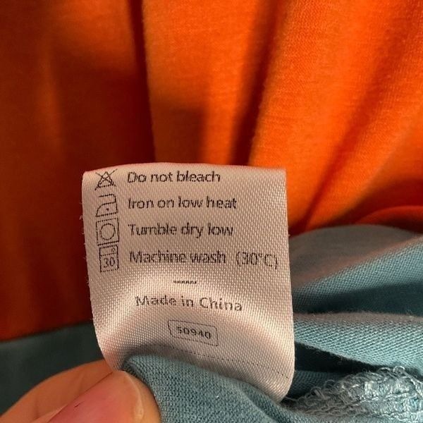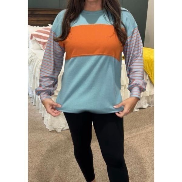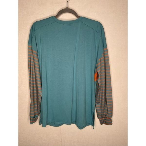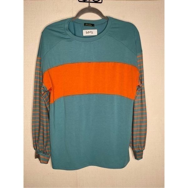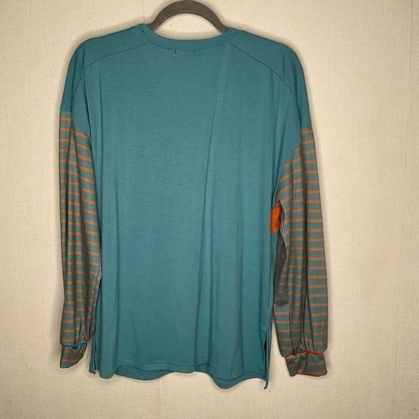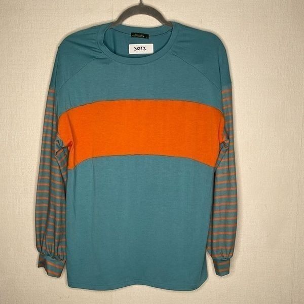 This OFEEFAN Long Sleeve Sweat Top Womens Large Colorblock Striped Teal Orange Shirt