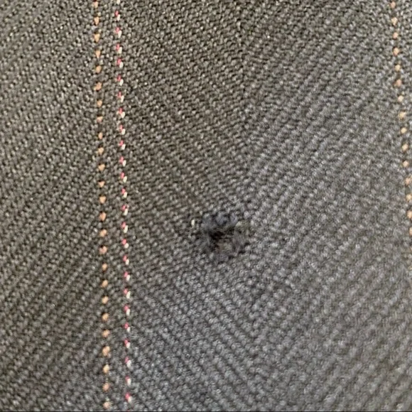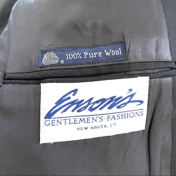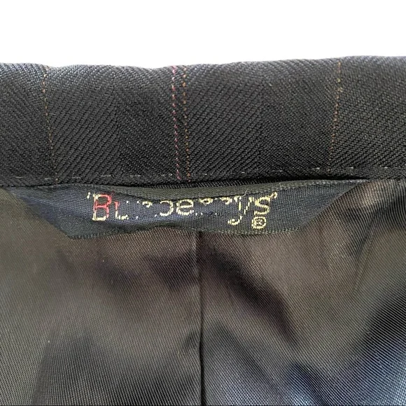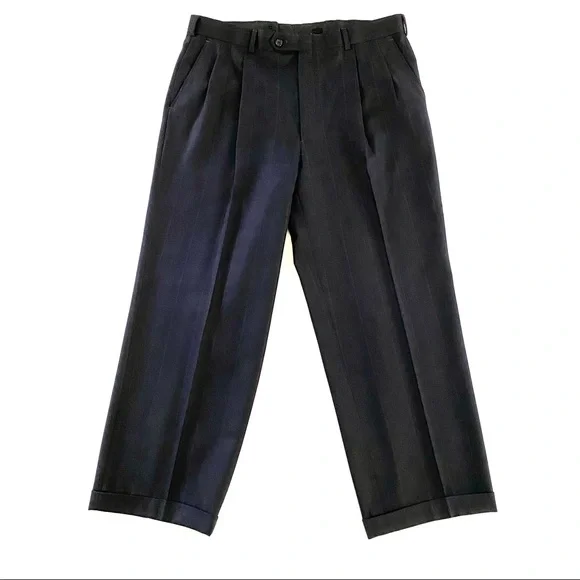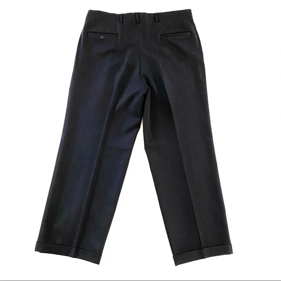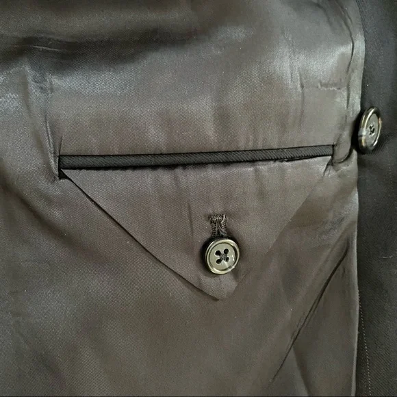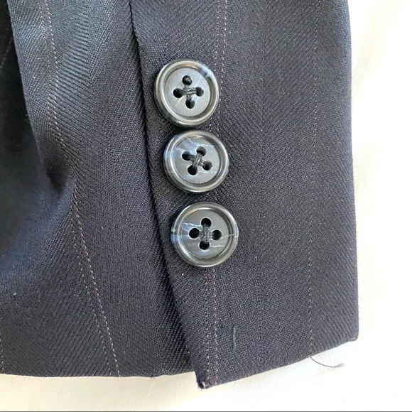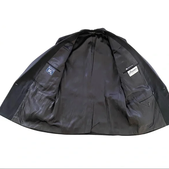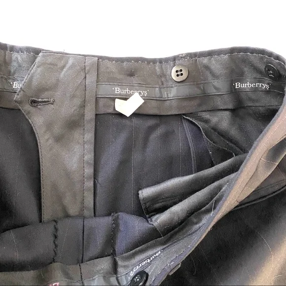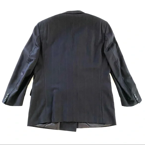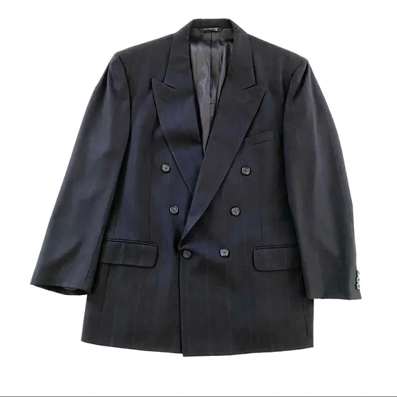 Vintage Burberry Double Breasted Suit Set. Navy color with extremely subtle red pinstripe. Size is approximately a 46R - estimated as there is no size tag and was custom tailored, but please see specific measurements below. 37in waist pants with cuff detail. Excellent overall condition. One small pinprick moth hole on the left should blade of jacket. Difficult to see unless closely inspected. Pants: outseam 39.25in., inseam 28in, waist laid flat 18.5in, rise 12.25inJacket: length (back midline below felt): 30.5in, chest 22.5in laid flat, shoulder seam to shoulder seam 19.75in, sleeve 24.25in, shoulder to hem (front side) 29in. If other measurements are needed, please comment.