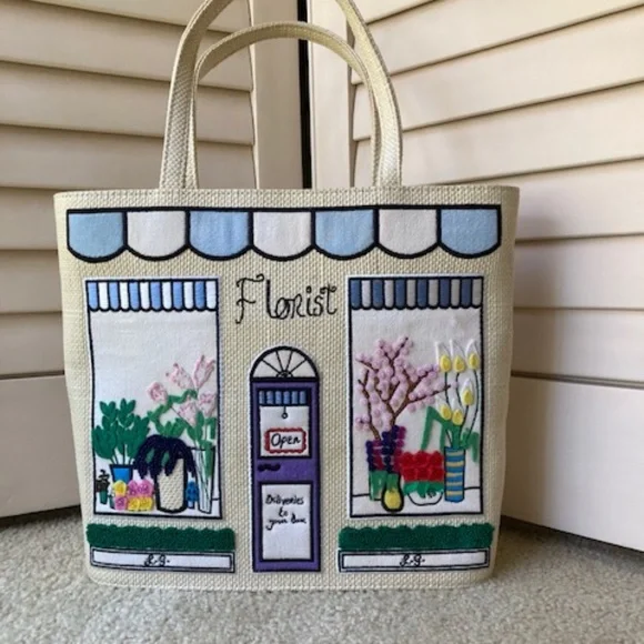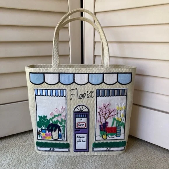 From the scalloped awning, floral arrangements in the store windows and front flower boxes, this is the perfect spring and summer tote bag🤗In excellent condition...Vinyl lined interior with a side slip pocketDuel handles and zipper closureSee the photos for detail and approximate measurementsThank you for looking!!!final sale