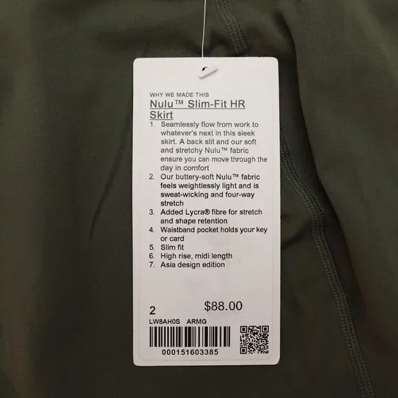 New Lululemon Women’s Size 2 Nulu Slim Fit High Rise Skirt ARMG Army Green $88We take our own photos!*Please note color may vary slightly in person due to lighting*Why shop with us?About UsWe have been in business for 7+ years and are trusted sellers with 22,000 sales and counting. Our goal is to provide a good shopping experience and above standard customer service. Please reference our reviews.100% AuthenticAll of our products are purchased from authorized retailers. If you have any questions we are here, just message us.Fast ShippingWe know you want your stuff like yesterday which is why all items are typical shipped within 24 hour of purchase (excluding weekends).Packaging with careYour purchase is just as important to us as it is to you which is why we take extra care to double bag you order to ensure its safe delivery.Read our feedback and buy with confidenceYour feedback is very important to us. It lets us and other potential customers know that you had a positive experience. If there was a problem with your order we are here to help. Please contact us so that we can work to resolve the issue.Stay connectedConsider saving our store by clicking the heart icon under seller information and be the first to know when new items are listed.Thank you for supporting our small business.