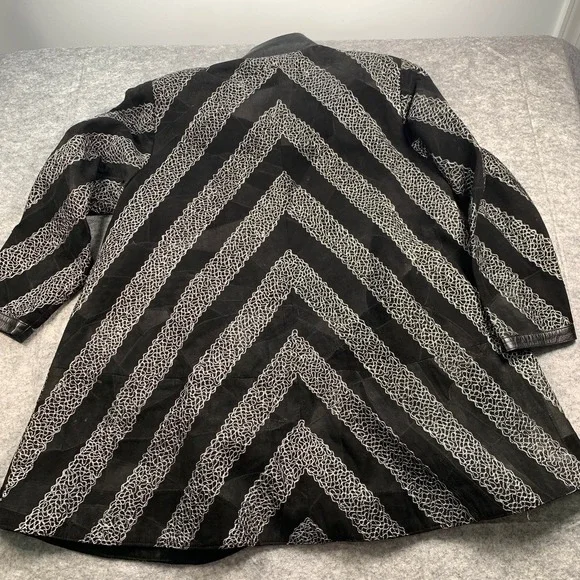 Leather Band Collar Womens 1X Silver Embroidery Mid Length Coat. Pictures don't do this coat justice! It is an amazing 100% leather coat with beautiful silver thread embroidery throughout with V patterns that mix the leather and embroidery. Coat has 3 buttons that button up from mid coat up to neck to give it a stylish open front flare. A staple piece to keep forever! fully lined with two side pockets. Pre-loved in great condition