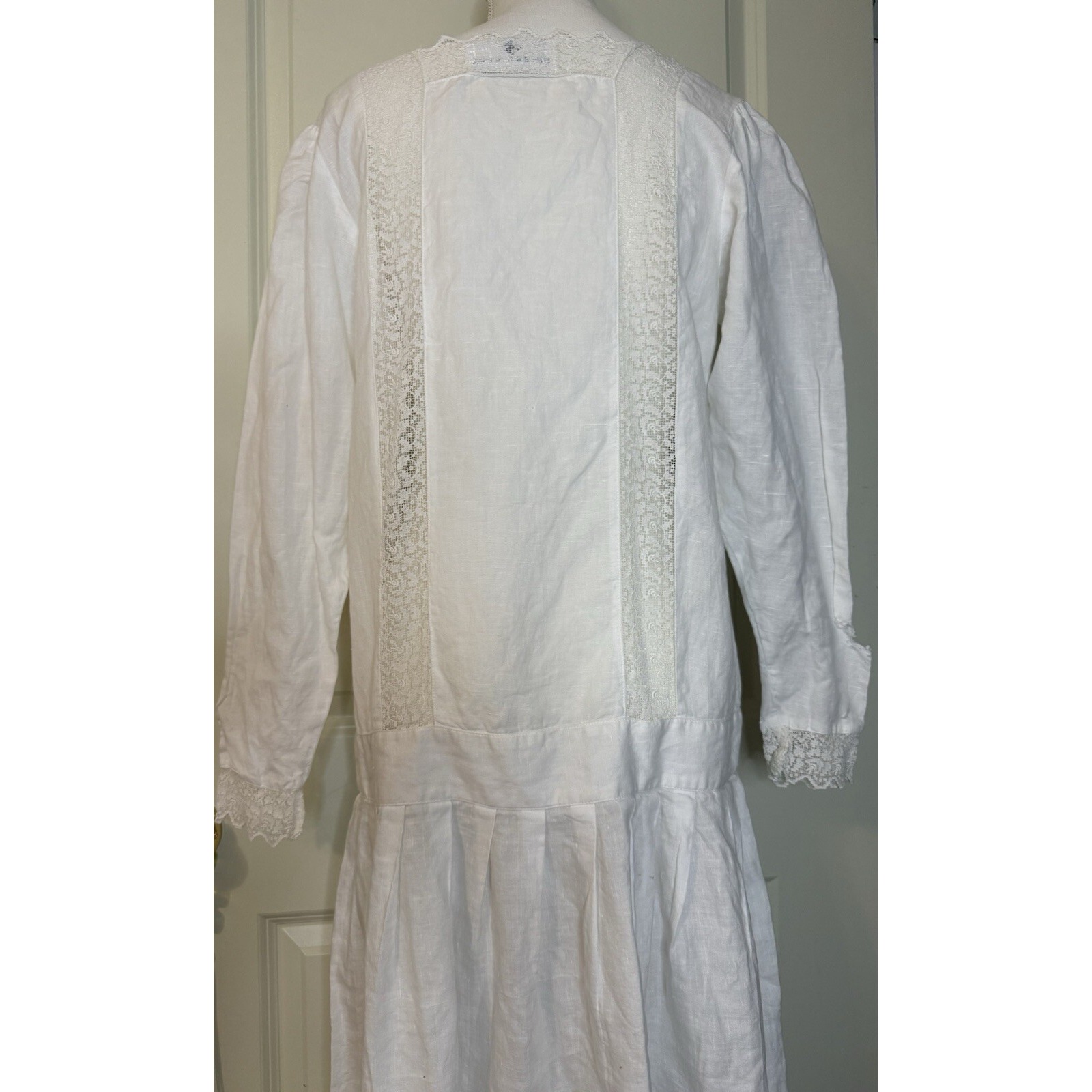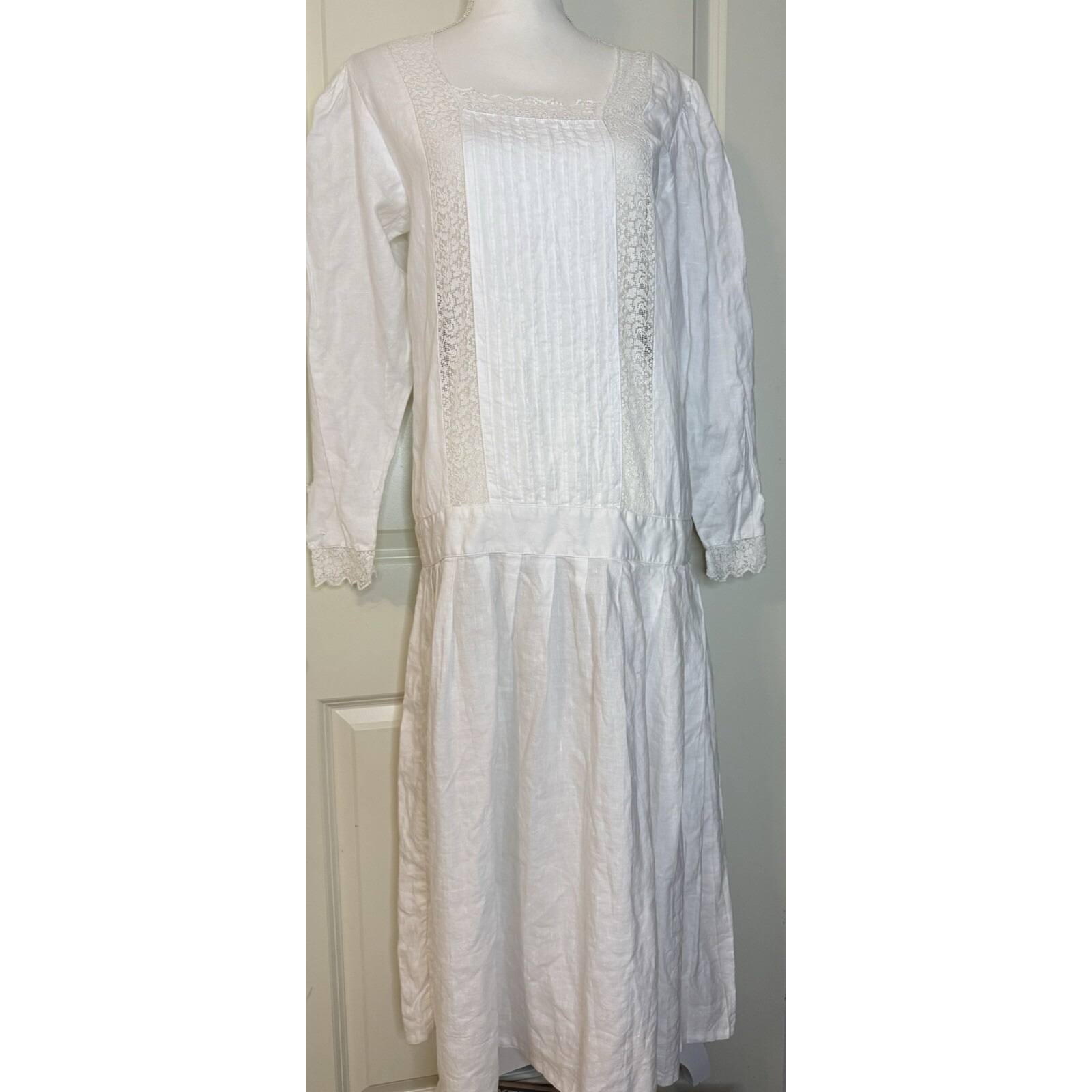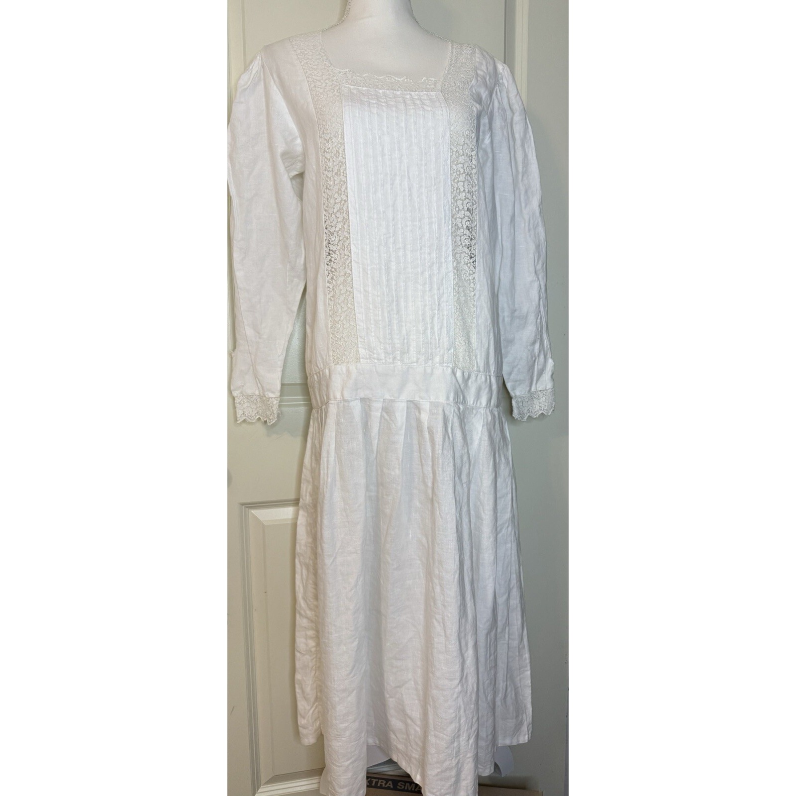 This vintage Eileen West prairie style dress features a square neckline, long sleeves, and a pullover closure. The dress is made from a combination of linen and cotton, and lace. The dress is accented with pleated and lace details, and has a drop waist design.