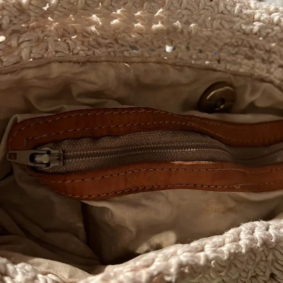 This is a rare boutique-made 1970s slouch shoulder bag crafted from luxe brown leather and hand-knit natural fiber. The cream body is beautifully textured and shaped with a casual, lived-in drape. A soft leather strap and cinch detailing add rich structure. The bag is fully lined with a snap and zipper closure.This bag isn’t fast fashion or mass vintage—it’s the real thing. It's 50+ years old, made to last, and worn with soul. It's a wearable art piece for collectors and style-makers alike.