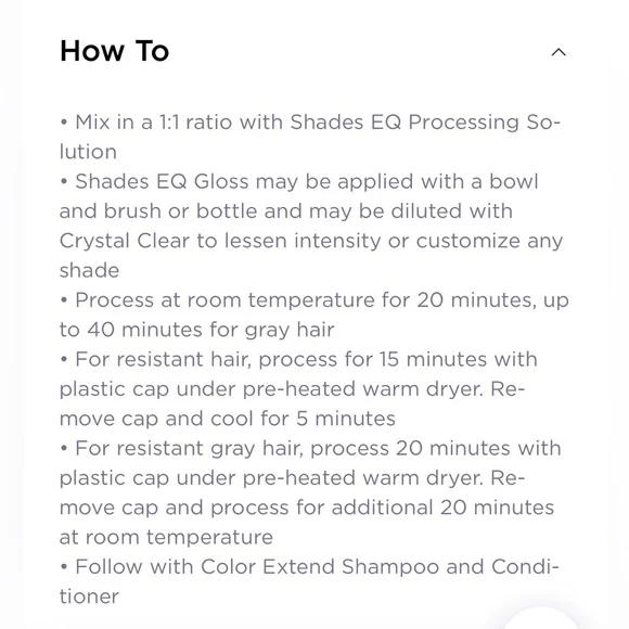 12 bottles shades EQ 9v 2oz1 year of the perfect shade of blonde! How TO• Mix in a 1:1 ratio with Shades EQ Processing Solution• Shades EQ Gloss may be applied with a bowl and brush or bottle and may be diluted with Crystal Clear to lessen intensity or customize any shade• Process at room temperature for 20 minutes, up to 40 minutes for gray hair• For resistant hair, process for 15 minutes with plastic cap under pre-heated warm dryer. Remove cap and cool for 5 minutes• For resistant gray hair, process 20 minutes with plastic cap under pre-heated warm dryer. Remove cap and process for additional 20 minutes at room temperature• Follow with Color Extend Shampoo and Condi-. tioner*processing solution sold separately