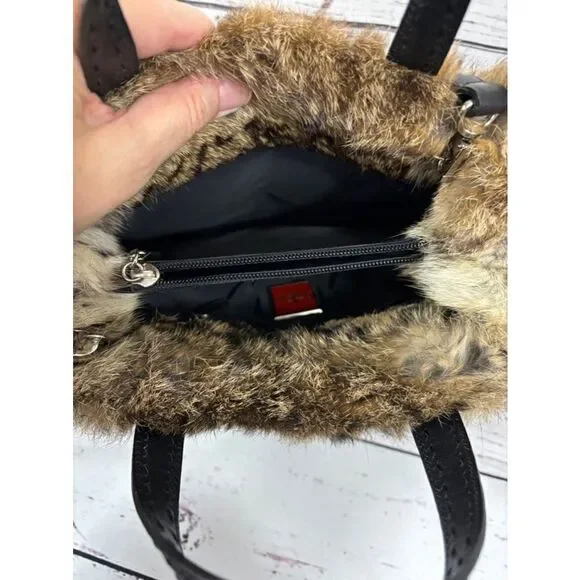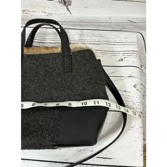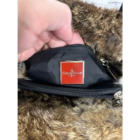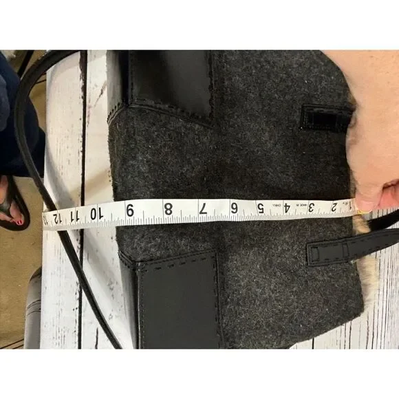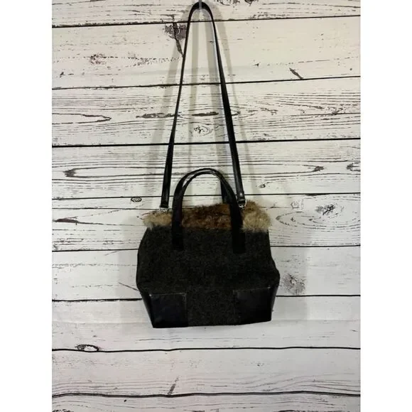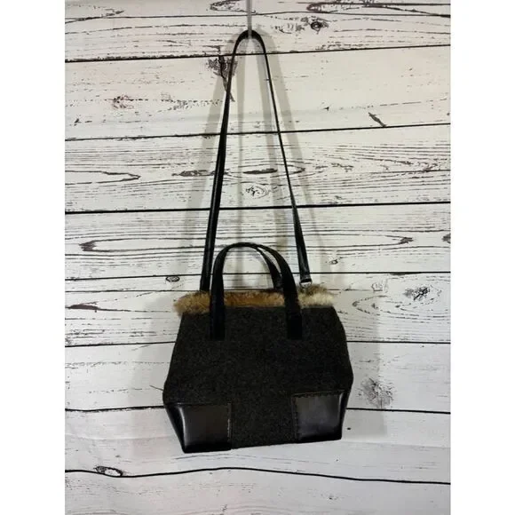 This is a pre-owned Cole Haan 1928 handbag. It is made of a gray wool blend fabric with black leather trim and a fur trim around the top. The bag has two top handles and a long adjustable shoulder strap. The bag has a zippered closure and a small interior pocket. The bag measures approximately 11 inches tall, 9 inches wide, and 4 inches deep. The bag is in good condition with some minor wear and tear. The fur trim has some shedding and the leather trim has some scratches. The bag is otherwise in good condition and ready to be enjoyed.